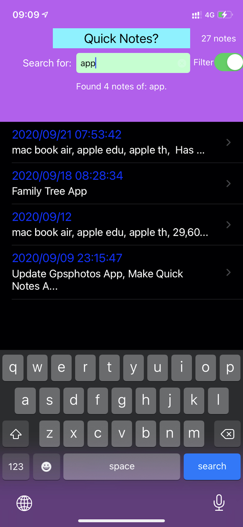 Search, Sort, Edit, Delete, Share, Filter-search, Search any string from keys and notes.