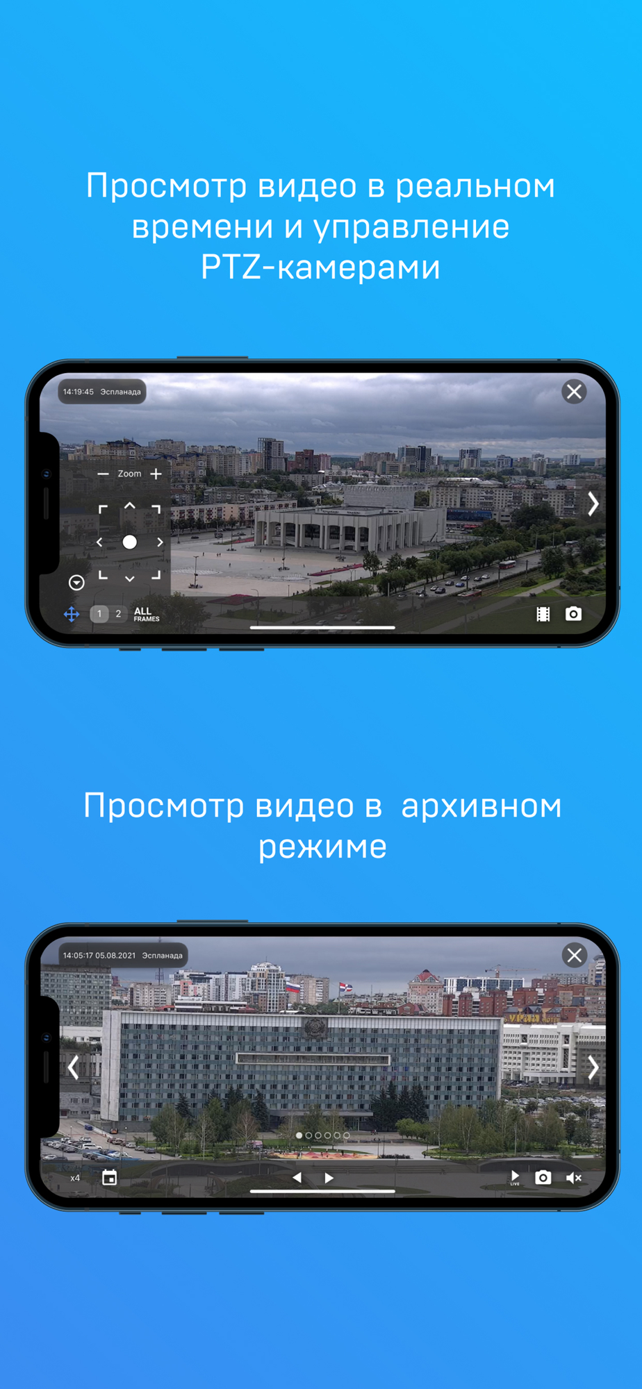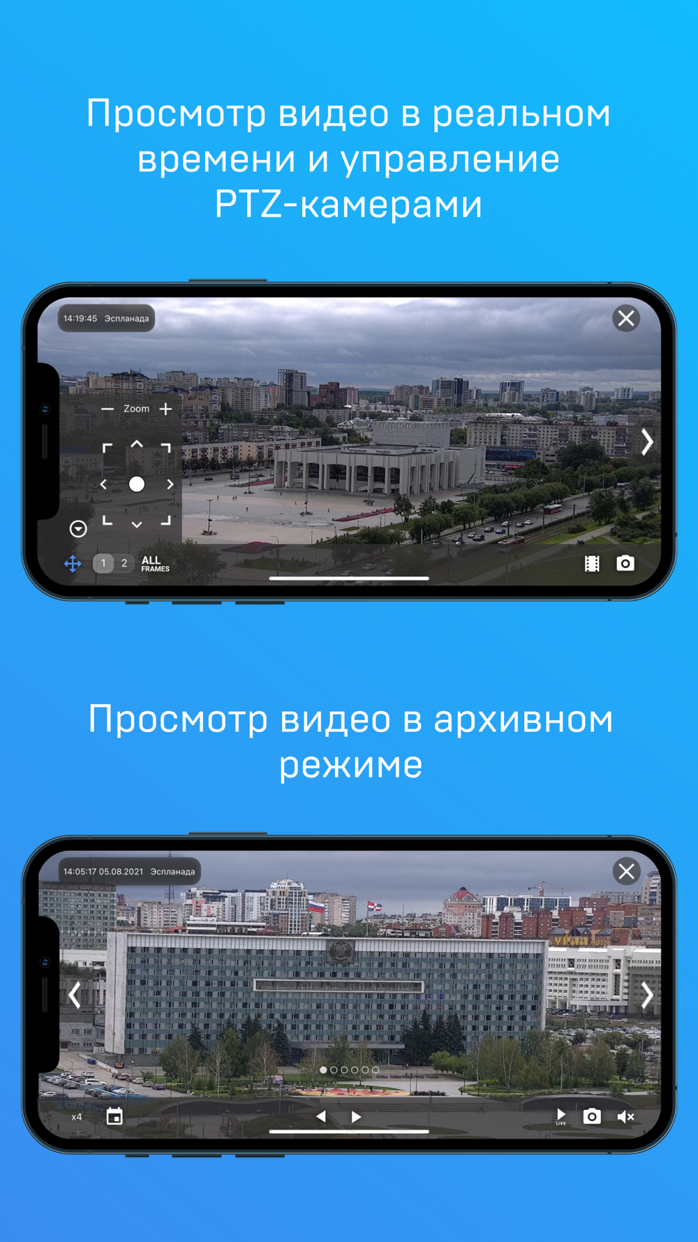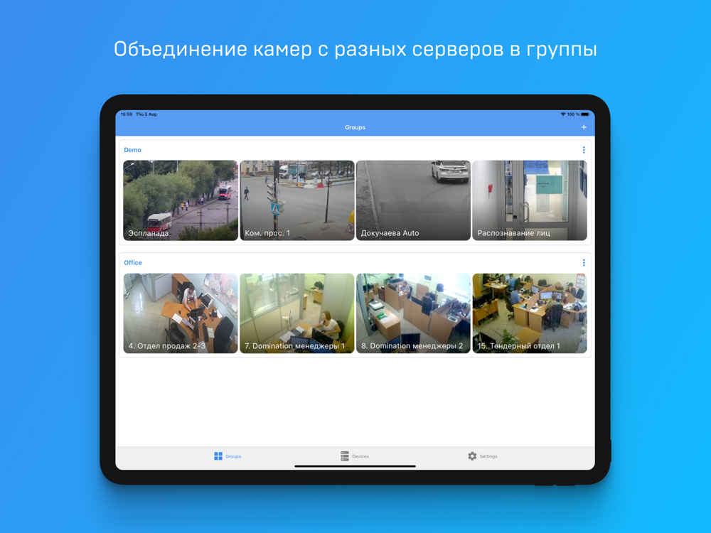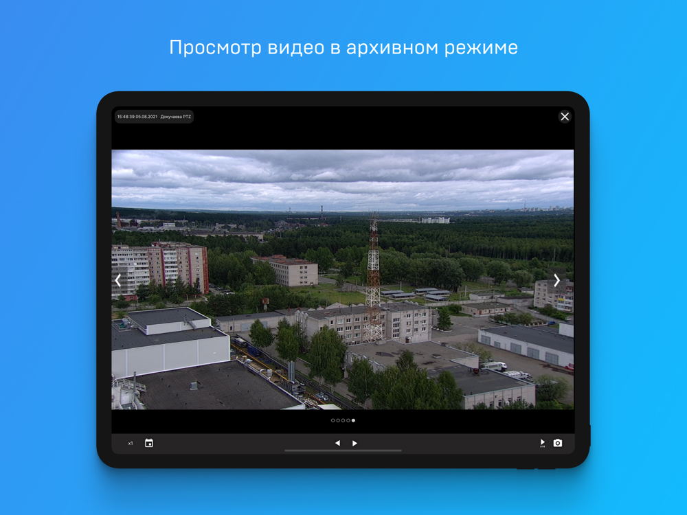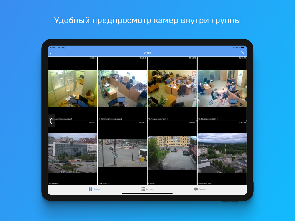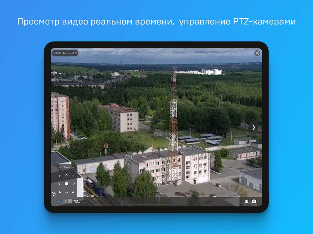 Интуитивно понятный интерфейс приложения позволяет создавать группы камер, оперативно переключаться между камерами и группами; осуществлять просмотр видео, как в реальном времени, так и в архивном режиме; управлять поворотными камерами; прослушивать звук.