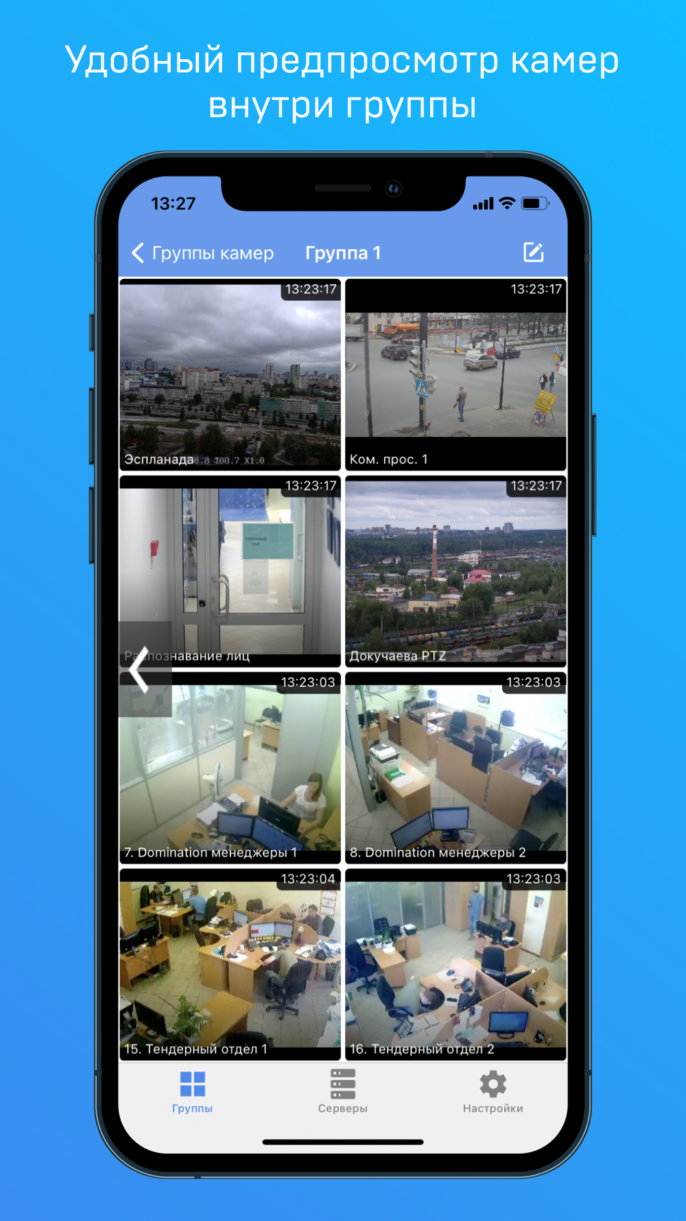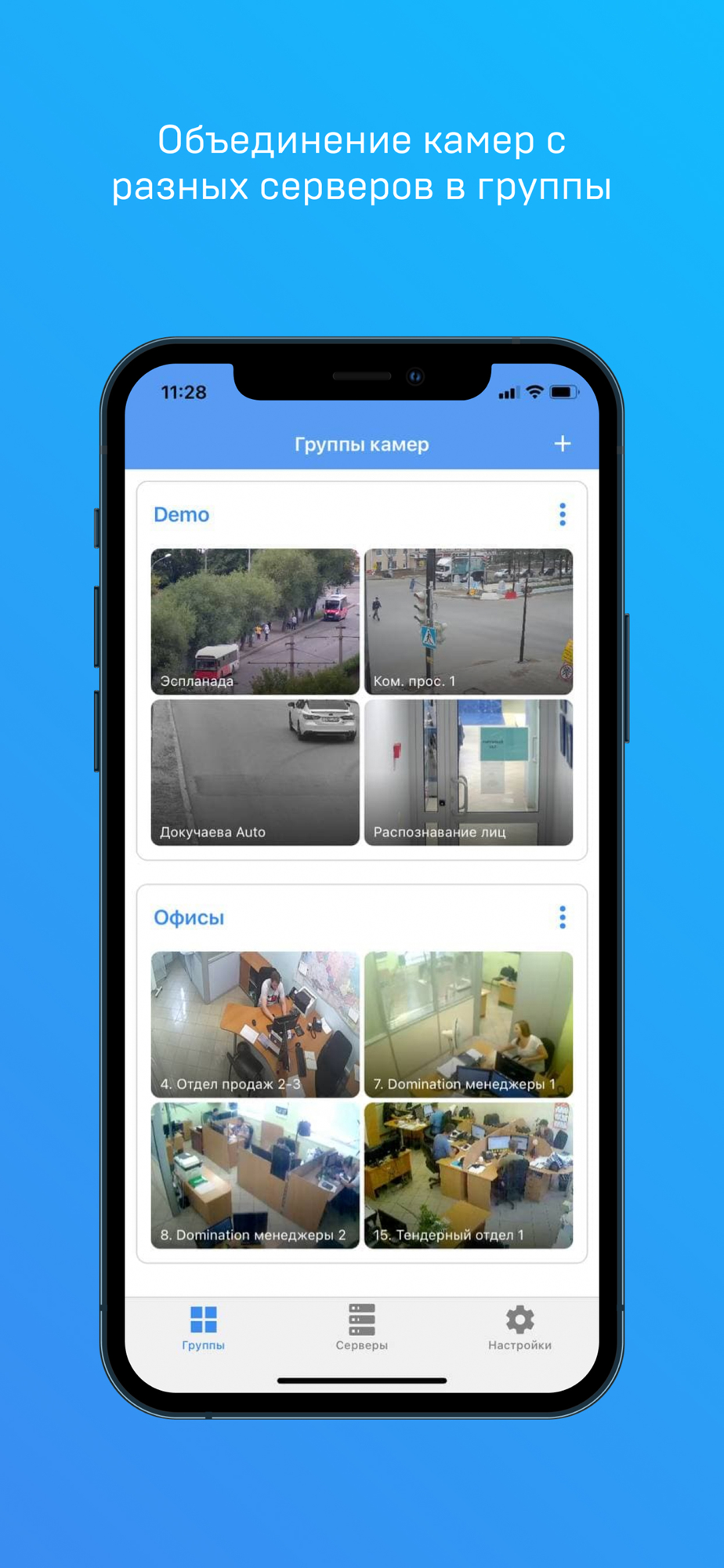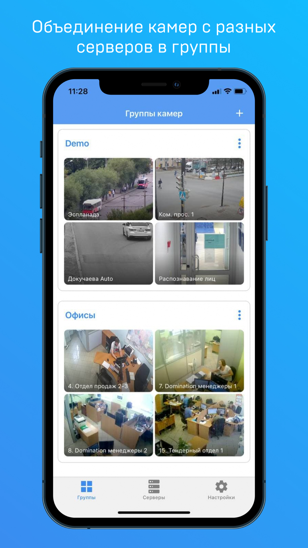 - Объединение камер с разных видеосерверов в группы.