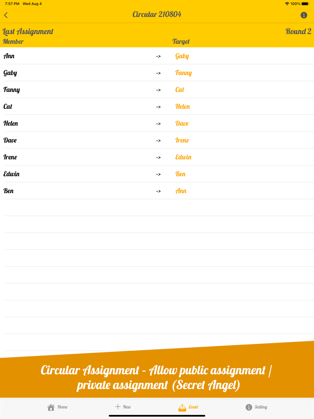 Circular - assign member to member as a circular loop. Allow publicly or privately assign (Secret Angel) option.