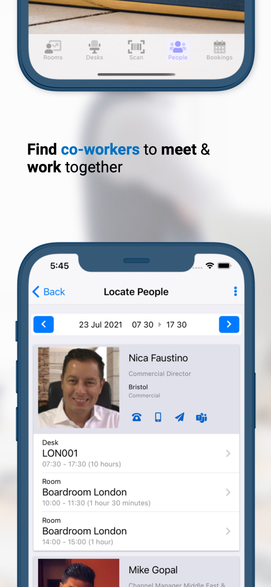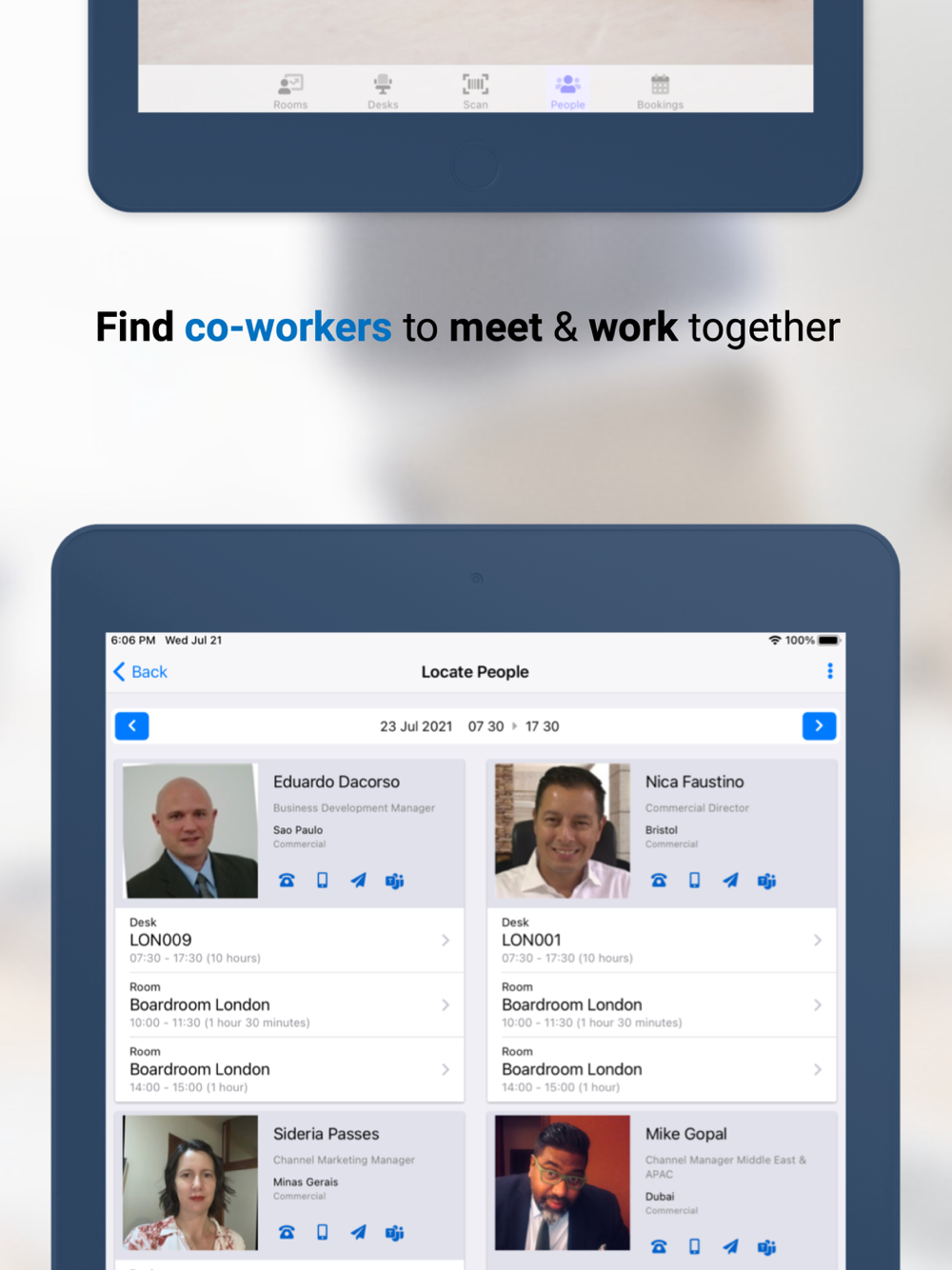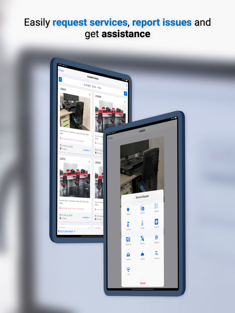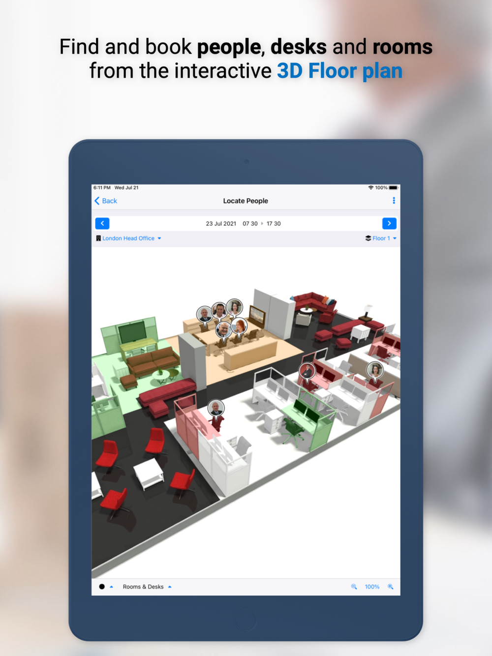 Quickly locate offices and plan your trip. Find your way around any office with an intuitive 3D Floor Plan. Maximise desk and room utilisation through check-in / check-out and no-show booking release. Locate colleagues and book a workspace near them to encourage an agile and productive working environment. Request services, report issues and interact with building services. Leverage workspace policies to determine employee bubbles for a safe, collaborative strategy.
