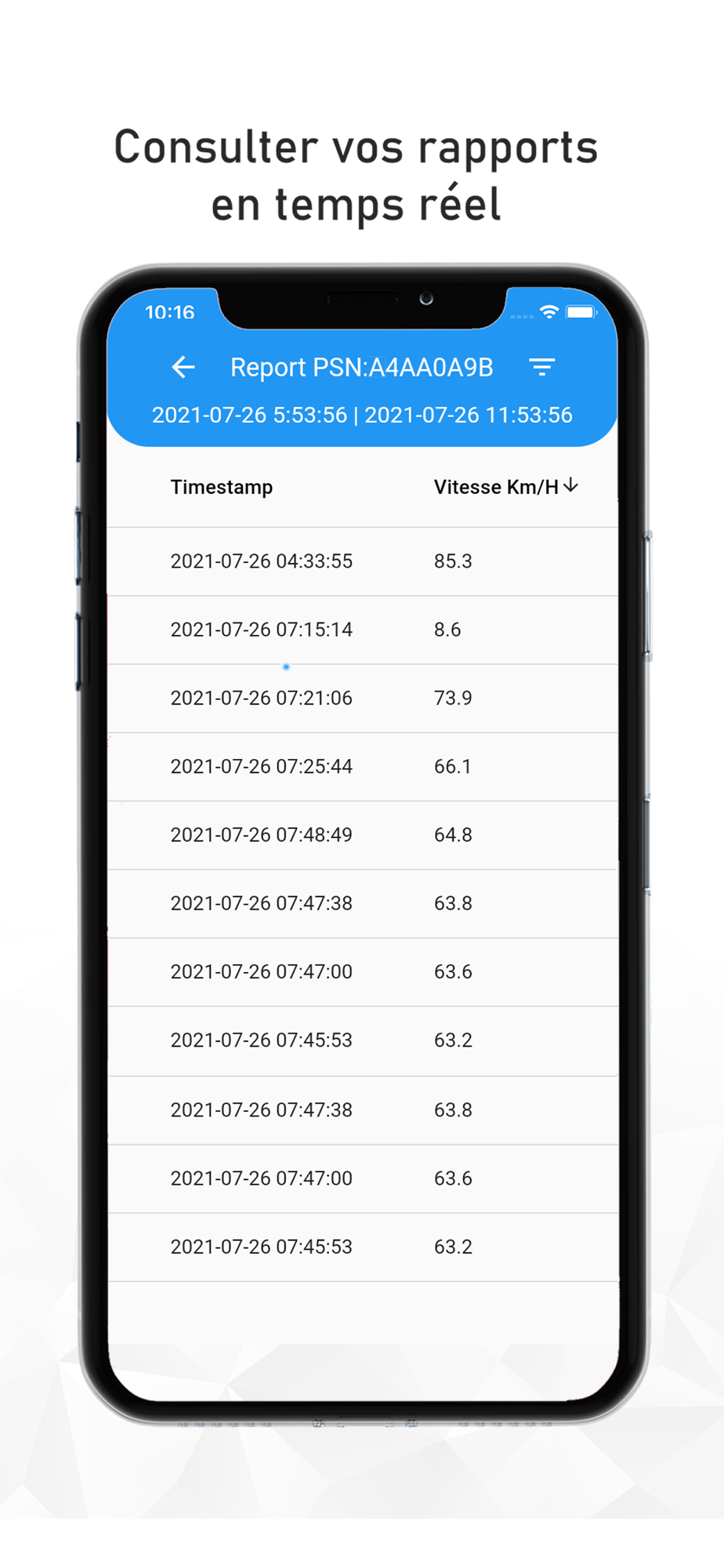 Fonctionnalisés de localisation GPS, Google Map, rapports en temps réel CSV.