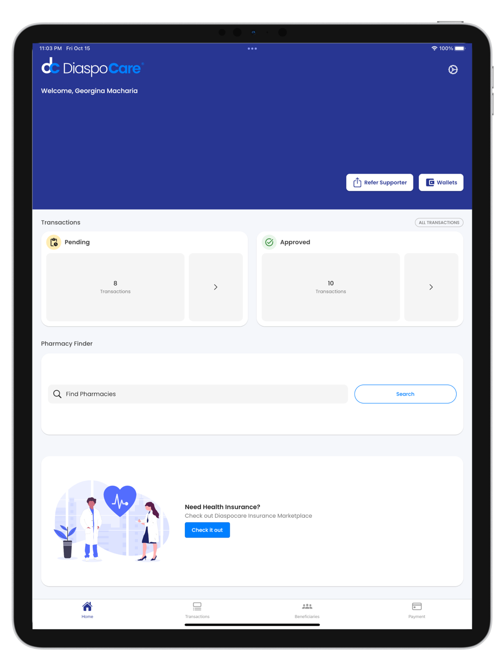 We are a digital healthcare platform connecting the African Diaspora to the pharmacists and clinicians back home. Whether separated by thousands of miles or living in another city, our healthcare financing services give you the peace of mind that your funds are used as intended delivering quality healthcare for your loved ones.