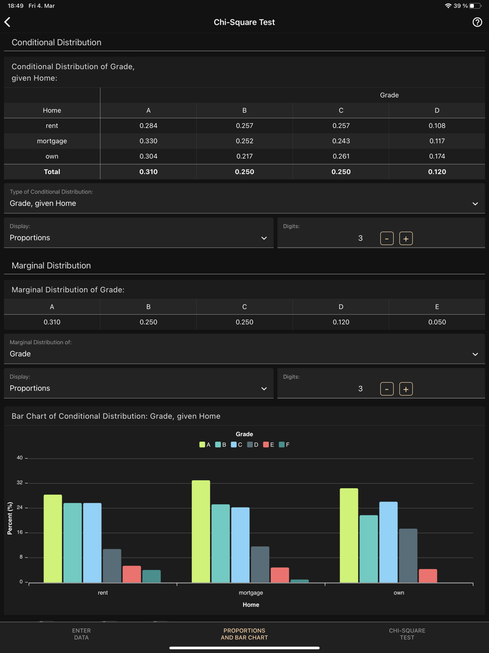 The app provides relevant plots (side-by-side or stacked bar charts, boxplots, histograms) and computes and visualizes confidence intervals and P-values for testing hypotheses. All relevant information (such as standard errors, margin of errors, z or t scores and degrees of freedom) are clearly displayed and labeled. The P-value is visualized on a graph for the normal, t-, or Chi-Squared distribution.