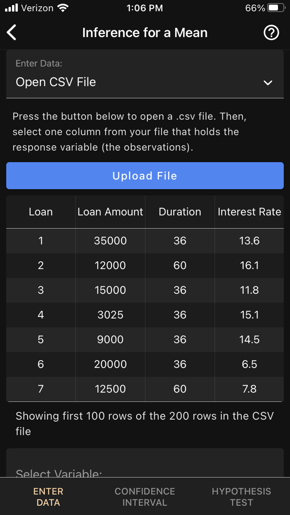 If you just have a few observations (or if you have the summary statistics), simply type them in or use the new Data Editor. For larger datasets, upload a CSV file of your raw data to a cloud account (such as iCloud or Google Drive) or simply email the file to yourself. Then, open the CSV file in the app and select the variables for your analysis. You can also simply copy & paste raw data from a spreadsheet app (such as Numbers on iOS or Google sheets). Sample datasets are also provided.