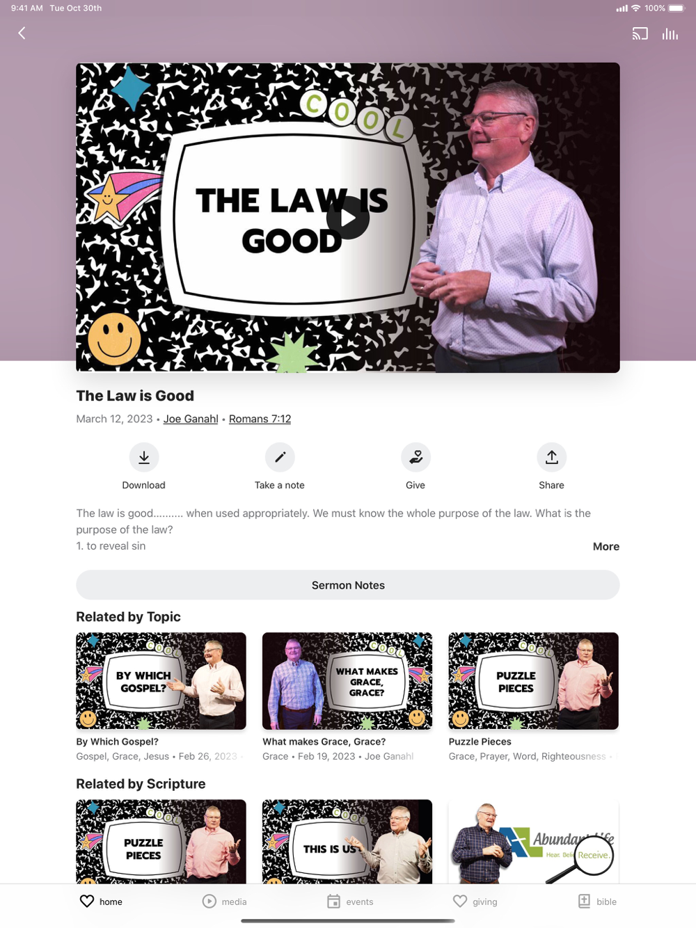 This app will help you stay connected with the day-to-day life of our church. With this app you can: watch or listen to past messages; stay up to date with push notifications; view upcoming events; and download messages for offline listening.