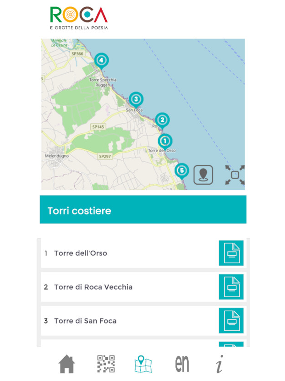 E’ possibile visualizzare sulla mappa tutti i punti di interesse da visitare e accedere ai contenuti anche attraverso QR code da scansire in maniera autonoma, dal proprio dispositivo.