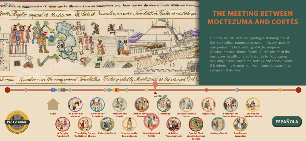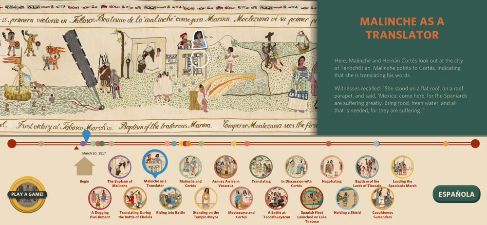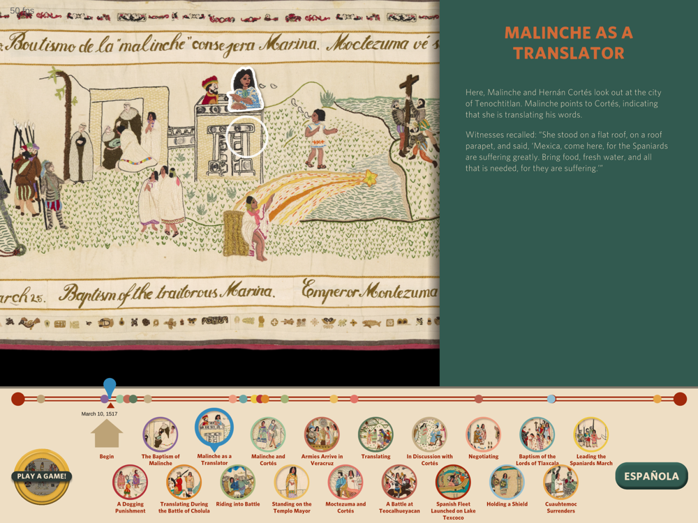 Tap on the colored circles along the scroll bar at the bottom to delve deeper into the scenes showing Malinche. If you’re feeling adventurous, tap the button in the lower right corner to play a close-looking game!