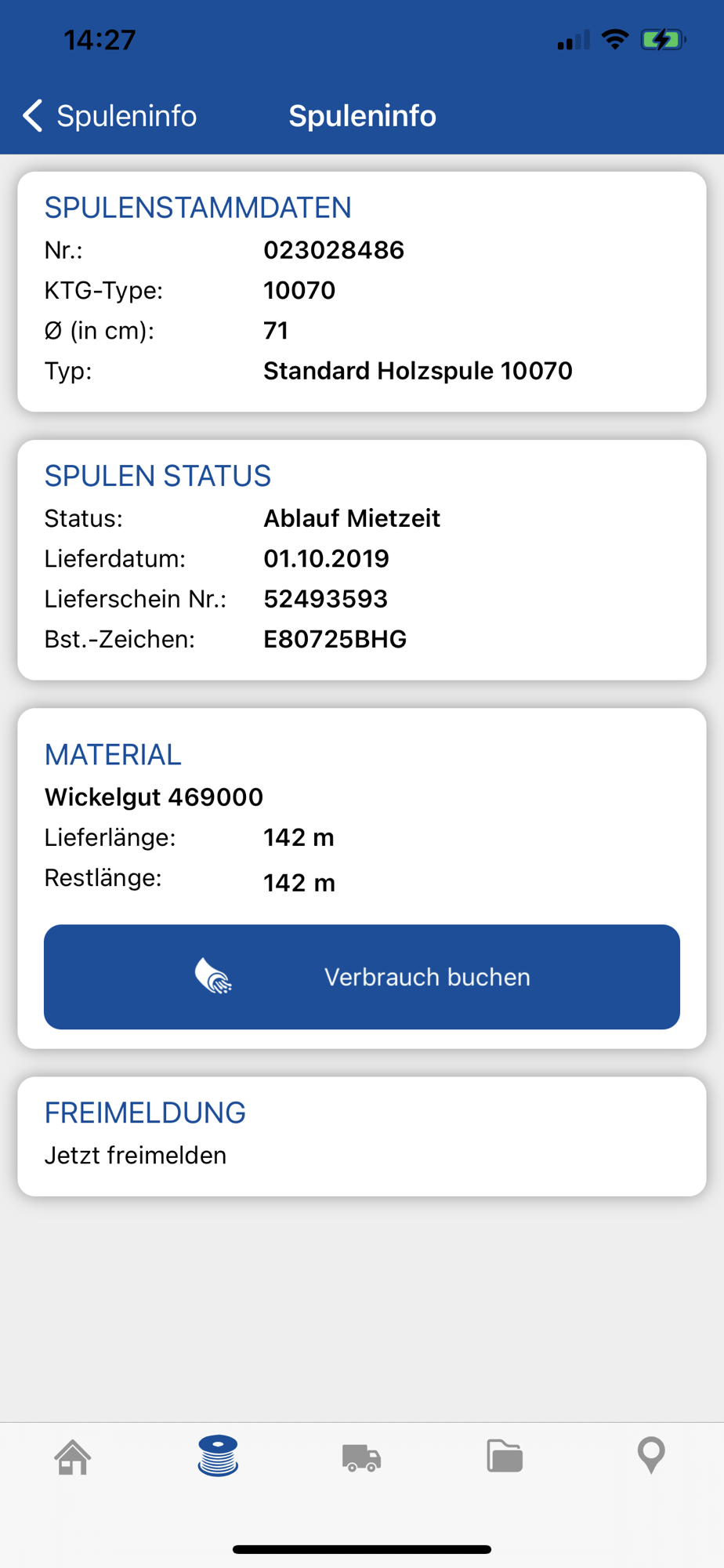 - Anzeige Spulenstatus (z. B. Lieferdatum, Leihzeit, Lieferscheinnummer, etc.)