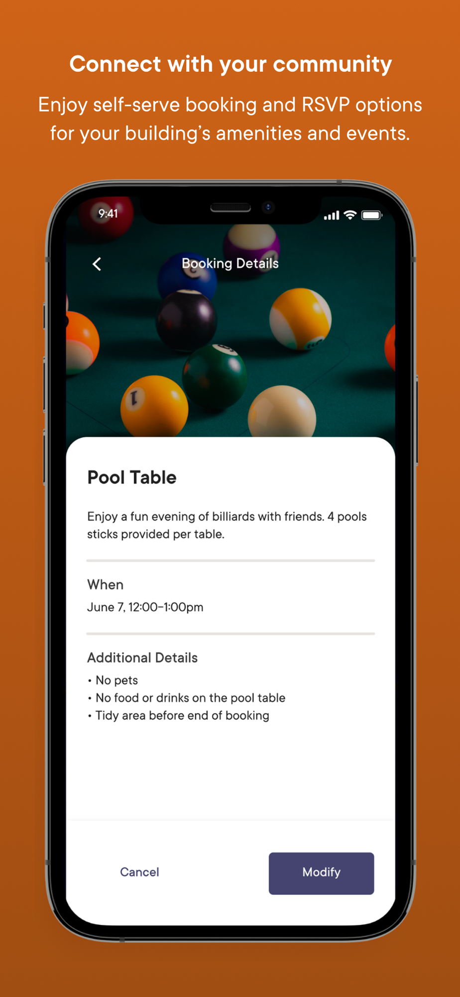 Amenity Bookings: Want to use the new roof-top deck? How about booking some space for a meeting? Easily book the amenities in your building when you need them.