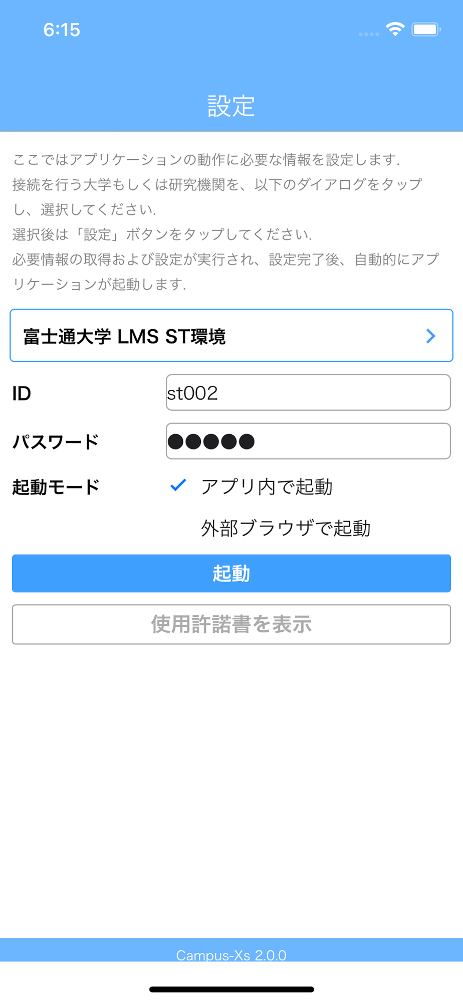 接続先に設定した大学/機関へのログインID/パスワードを使って本アプリで