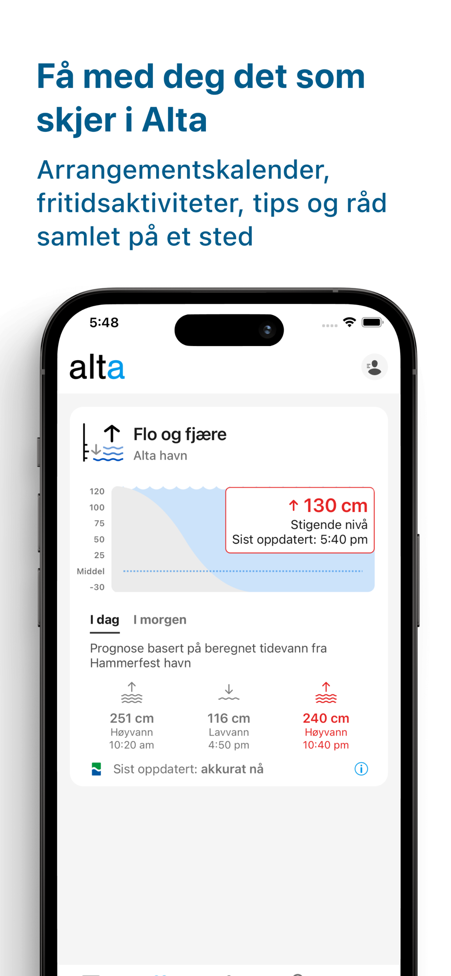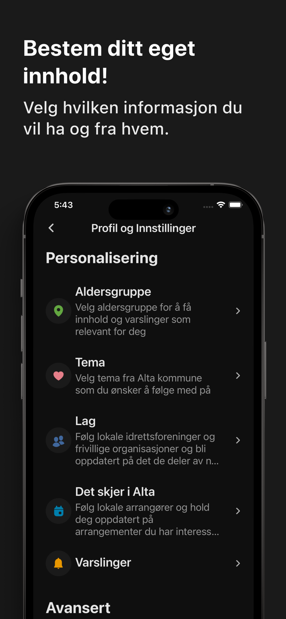 Appen om Alta gir deg siste nytt om aktiviteter i ditt nærområde og meldinger fra kommunen tilpasset dine interesser og behov. I denne appen er det du som bestemmer innholdet, slik at det blir relevant for deg. Løsningen sørger for å samle aktiviteter fra kommunens lag og foreninger i en og samme kanal. I appen finner du også en kalender basert på dine interesseområder.