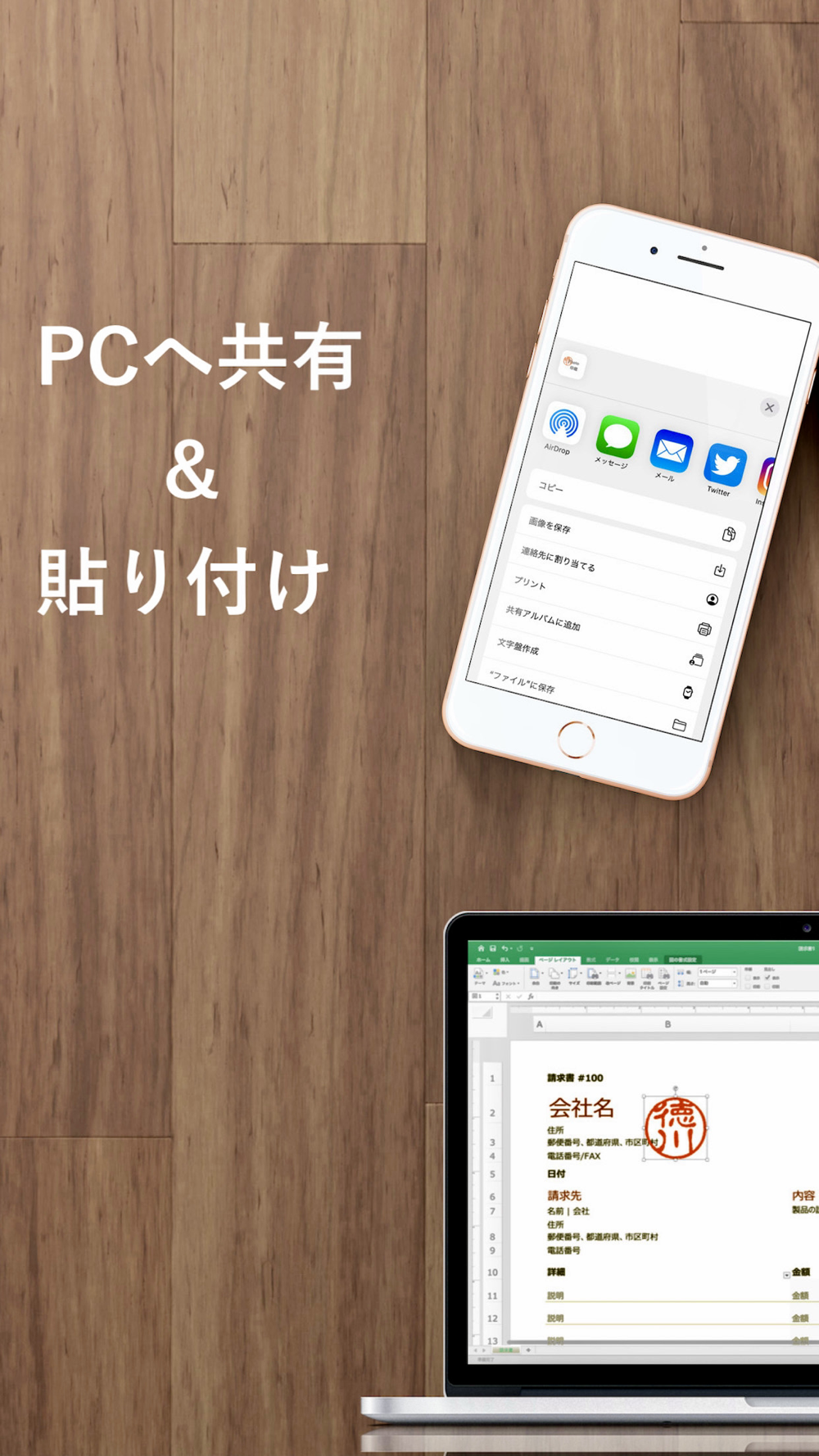 ボタンひとつでメール添付、AirDrop、SNS共有、そして写真ライブラリへ保存できます。ExcelやWordにドラッグ&ドロップで貼り付けることができます。アプリ上では画質が低く見えますが、拡大表示しているためです。書類上では本物のように自然に見えます。書類に貼り付け後、最終的なサイズ調整を行なってください。