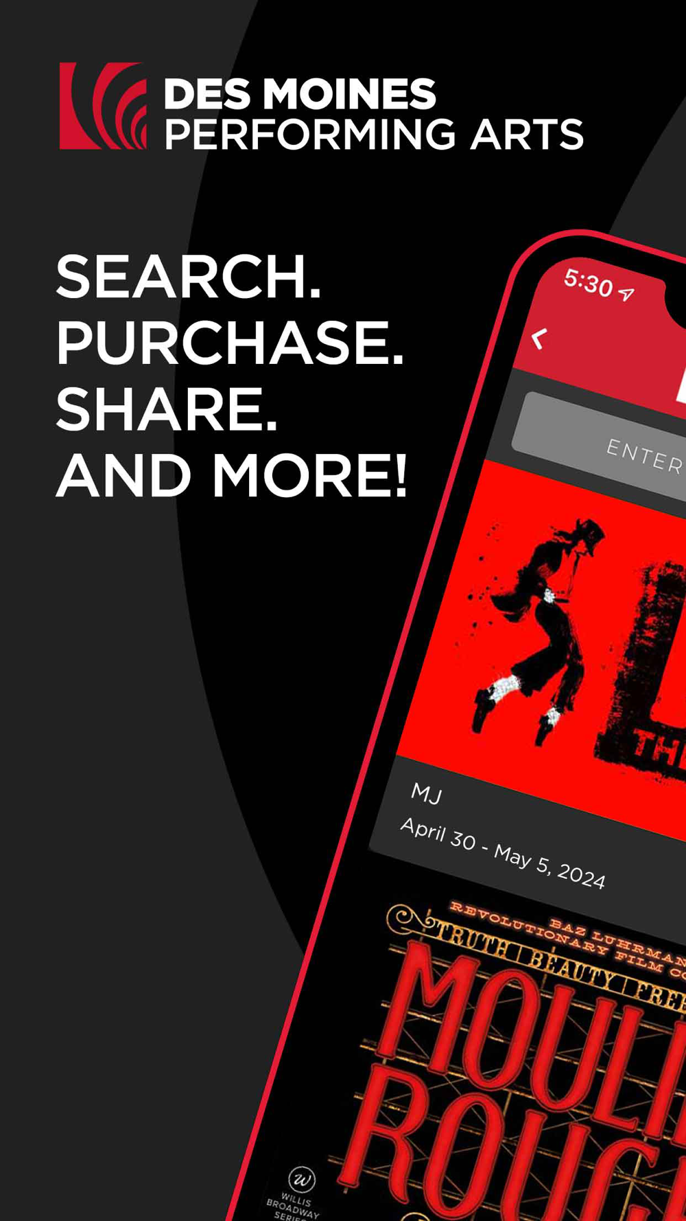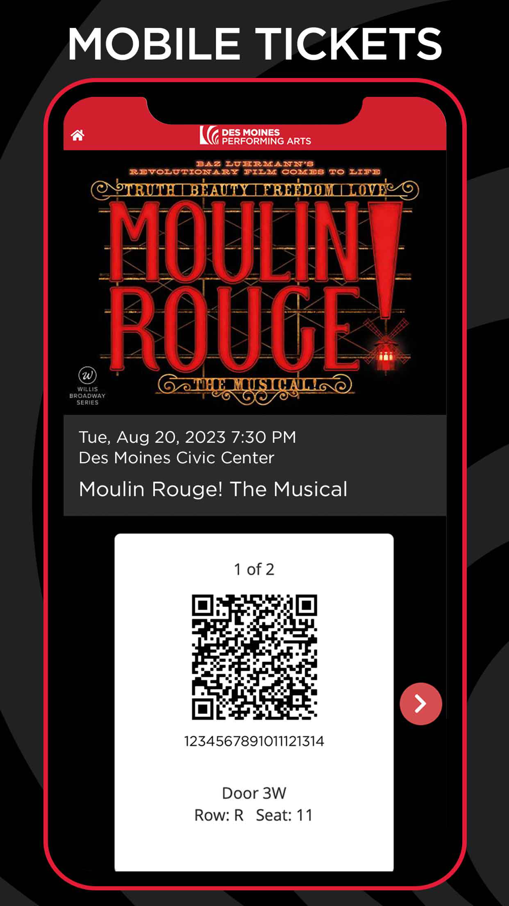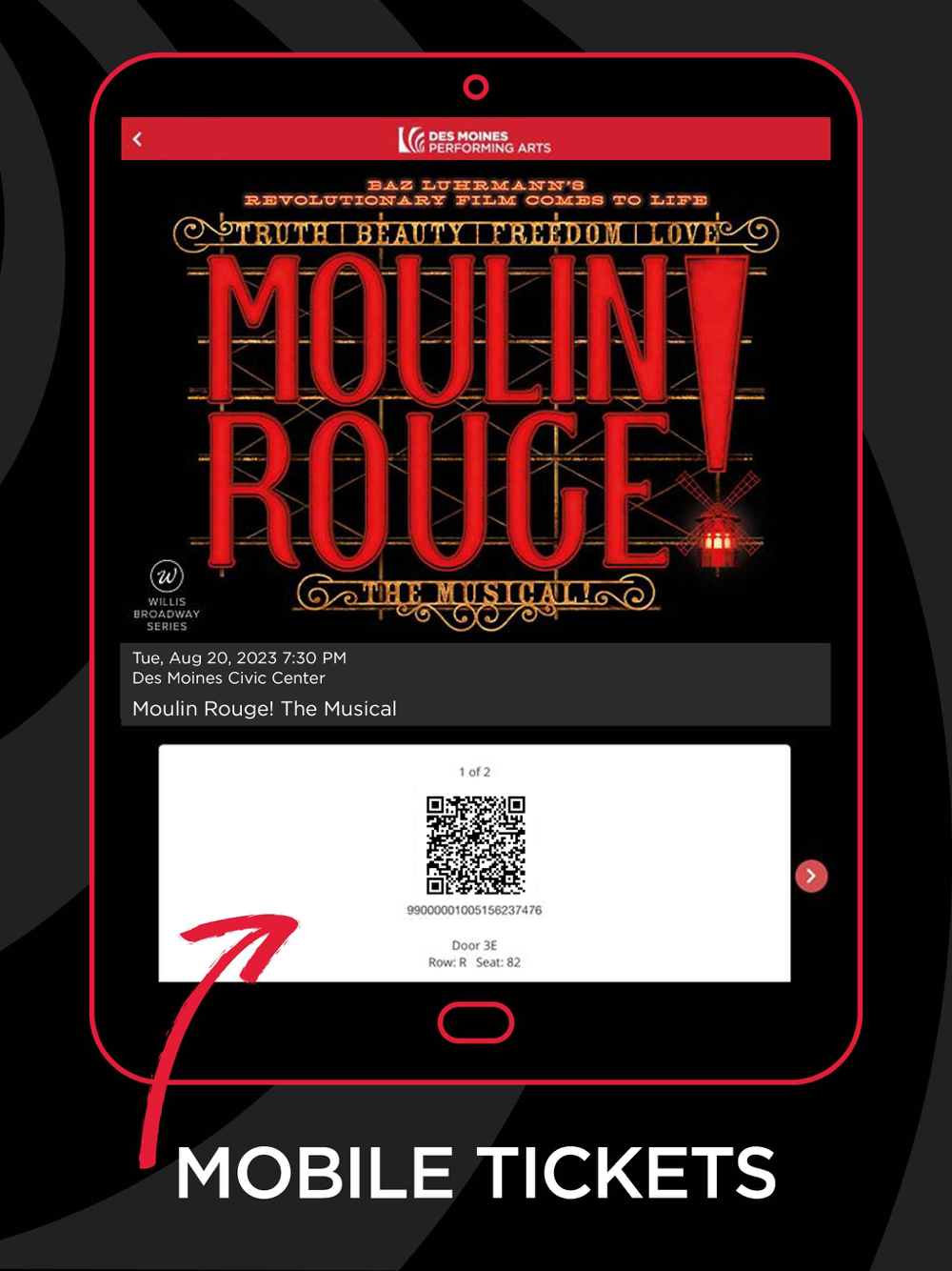 This app is the best way to access your tickets, browse upcoming events at our venues, and much more! Any ticket you purchased through Des Moines Performing Arts will be available and up-to-date in the free DMPA app even if your tickets have been exchanged or a different delivery method was previously selected.