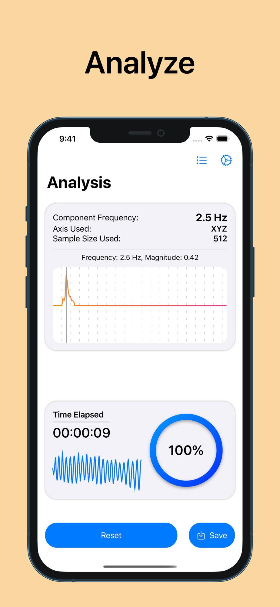 Simply press the start button to start collecting accelerometer data. Once enough data points have been collected, Tremor Analysis automatically performs a Fast Fourier Transform (FFT) which outputs the component frequencies and magnitudes.