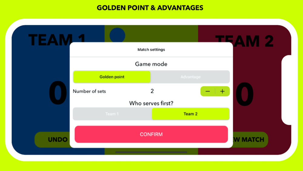 With Padel scorekeeper, you don't need to keep in mind your score anymore. Just press the button, and the app will SCORE and SAY your point.