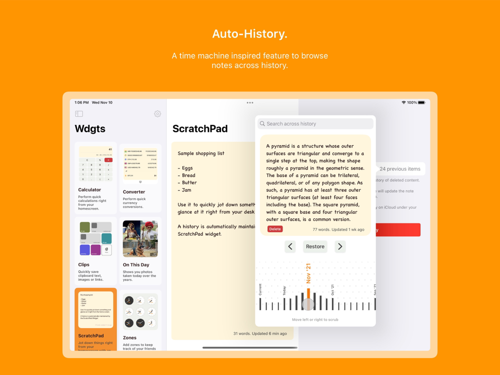 Maintains an automatic history of all calculations made in calculator or converter and notes in the scratchpad widget.
