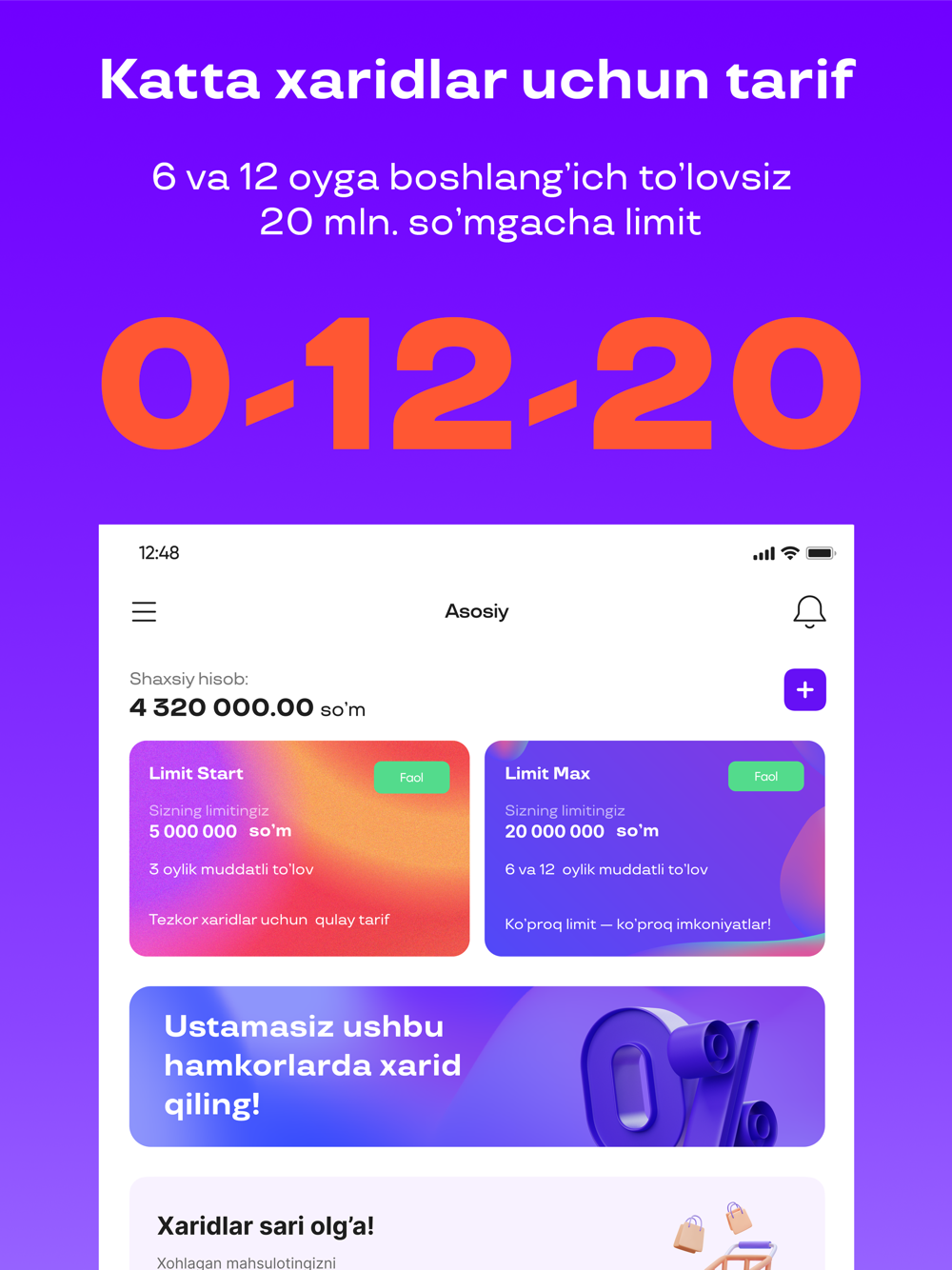 Saytda yoki ilovada ro'yxatdan o'ting. Buning uchun sizga pasport yoki ID-karta va bank kartasi kerak bo'ladi. Undan so‘ng, O'zbekiston bo'ylab kerakli tovarlar va xizmatlarni 25 000 000 so'mgacha bo'lgan limit bilan muddatli to'lovga xarid qilish imkoniyati ochiladi.