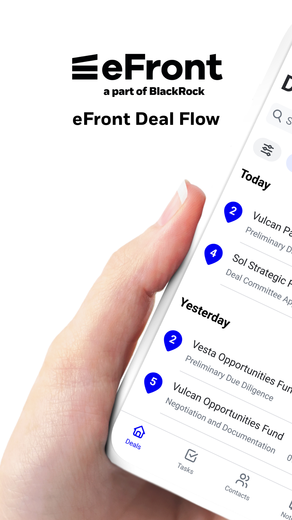The eFront Deal Flow mobile app is an extension of the eFront Invest desktop platform’s deal management module – designed for the on-the-go use case. The app is read and write, it syncs all user input between mobile and desktop, resulting in smooth collaboration between remote teams. The app enables deal managers to manage their deals, contacts, tasks and notes on the road. Available for eFront Invest Deal Flow clients only.