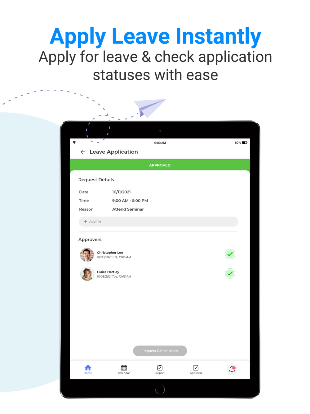 • Apply your leave from your smartphone easily and instantly get approval from your superior through the same method.