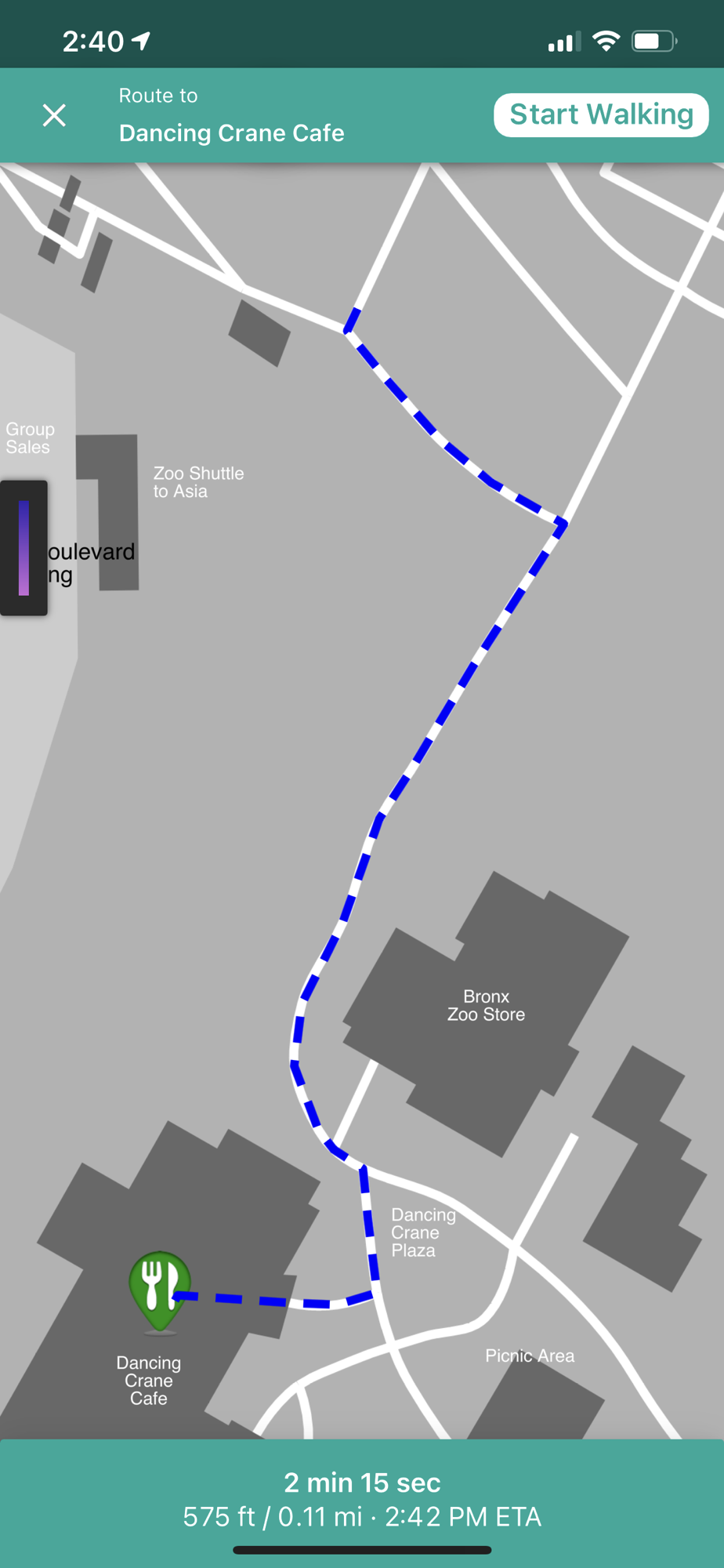 - Navigates you to the quickest path to walk from your current location to what you are looking for.