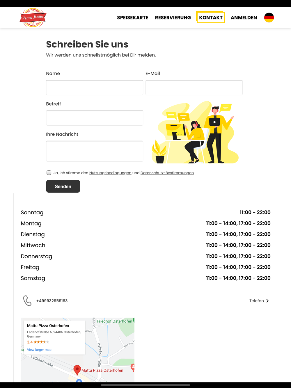 Mit der Pizza Mattu Osterhofen Mobile App können Sie Ihre Pizzeria bequem von zu Hause aus genießen. Stöbern Sie in unserer Speisekarte, wählen Sie die Gerichte aus, die Ihnen schmecken, und geben Sie Ihre Bestellung in Sekundenschnelle auf.