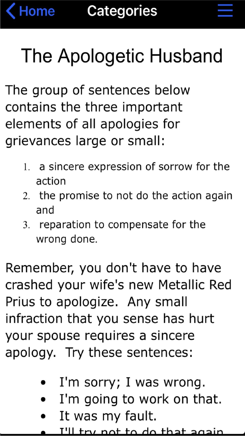 Each sentence for "The Perfect Husband" app is click-able to an expanded explanation. Use this list to randomly pick a sentence that's appropriate for today, OR click on CATEGORIES if you're looking for the perfect phrase when you need to apologize or want to be supportive! For an expanded list of great words or quotes, check our twitter feed.