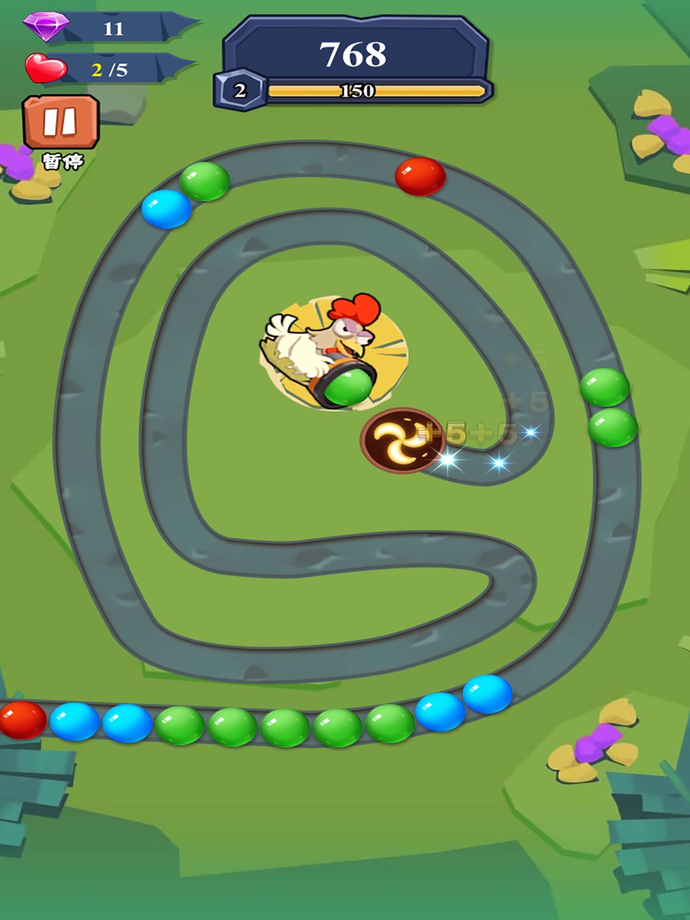 清新的界面,欢乐的背景音乐,加上游戏的主人翁-小鸡祖玛坐在其中,吐出各种颜色的珠子。环绕着石青蛙的是载着彩球的轨道,彩球会沿着轨滚动。小鸡吐出彩球进入轨道,轨道上颜色相同的彩球,数量达到三个以上就会消除得分。看似简单的游戏经过精心巧妙的设计后,让人玩起来趣味无穷。