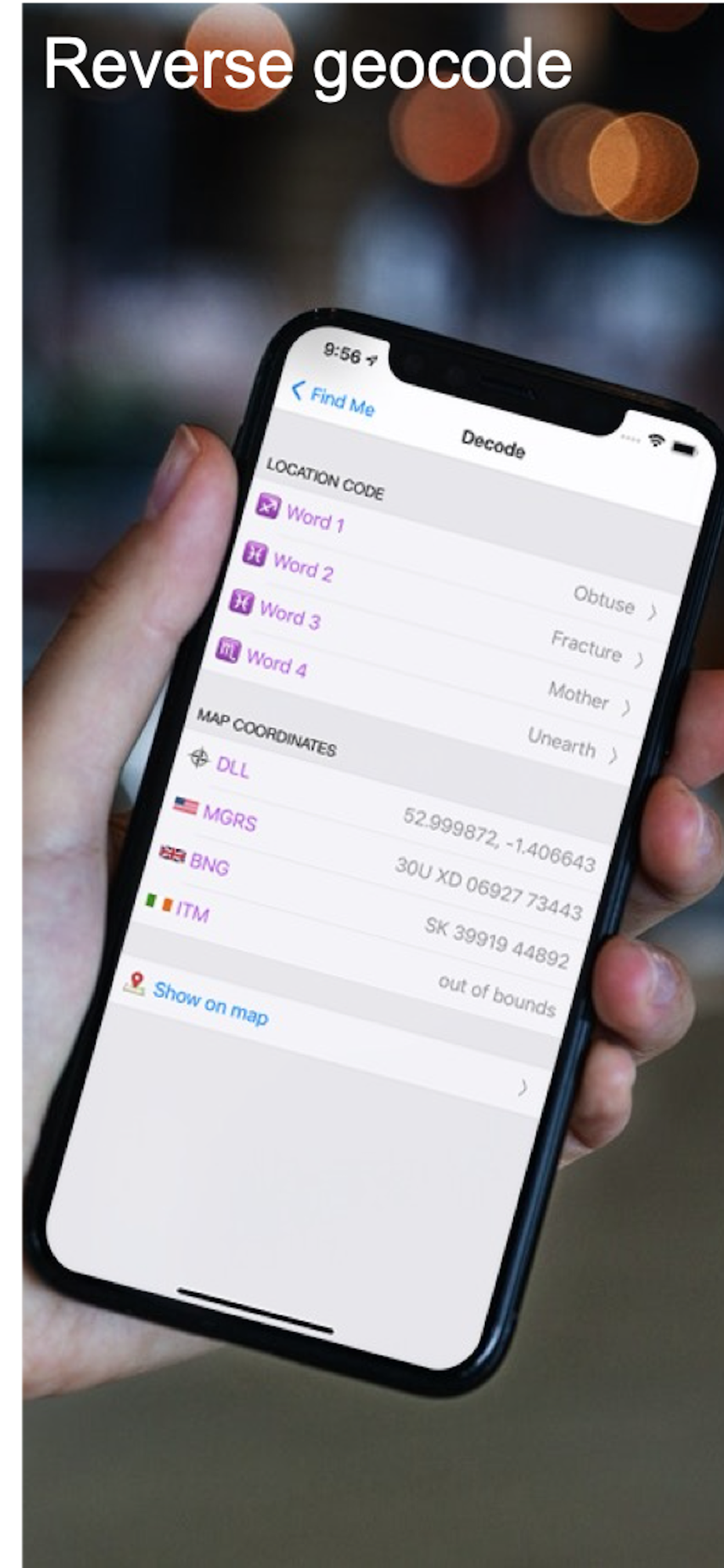 FindMe SOS encodes your position with 4 words. These 4 words define your unique location within a 20 metre square. FindMe is valid for the UK, Ireland and the conterminous USA.