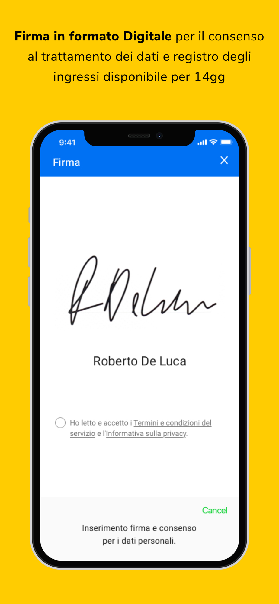 - "Check in con operatore": l'Operatore scansiona il Green Pass del Cliente per verificarne la validità e raccoglie la sua firma digitale direttamente sullo schermo dell’ ipad per l’autorizzazione al trattamento dei dati personali;