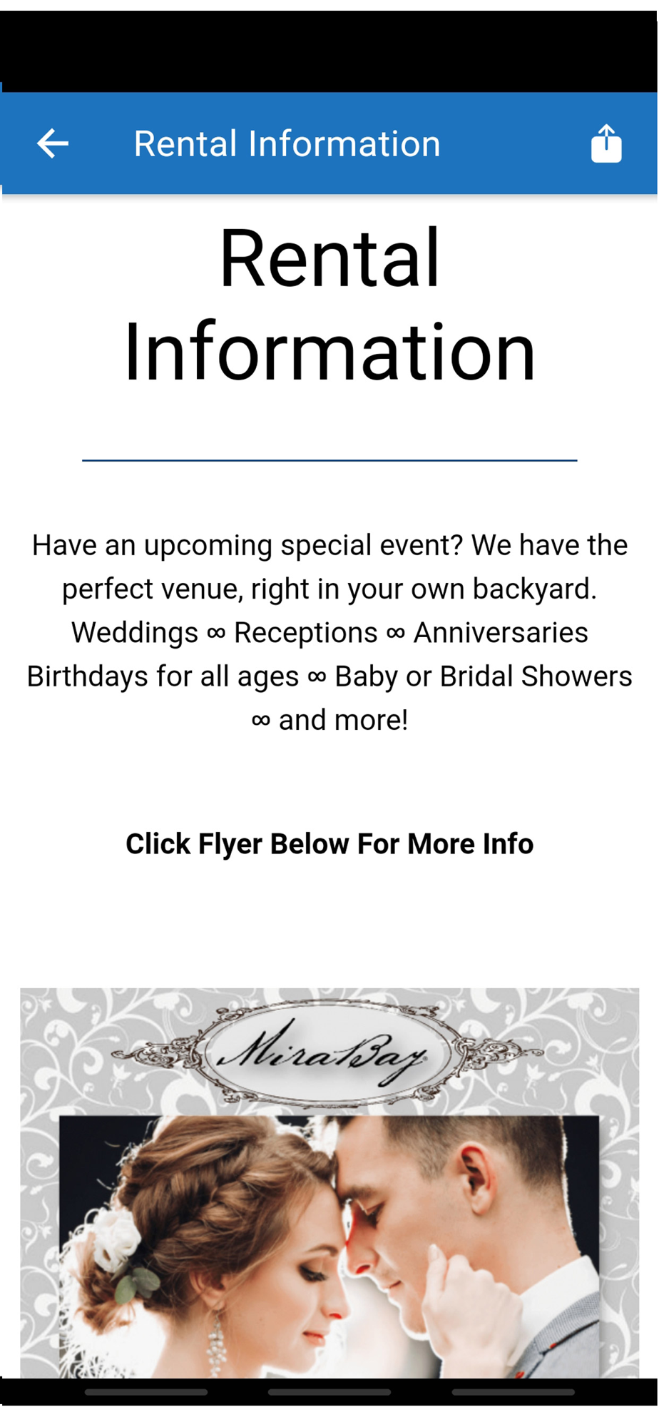 Download the MiraBay mobile app, so you can have instant access to your community at your fingertips. This app is proudly brought to you by your management partner, Vesta Property Services. If you have any questions or comments about using this app, please contact us at [email protected]. Thank you.