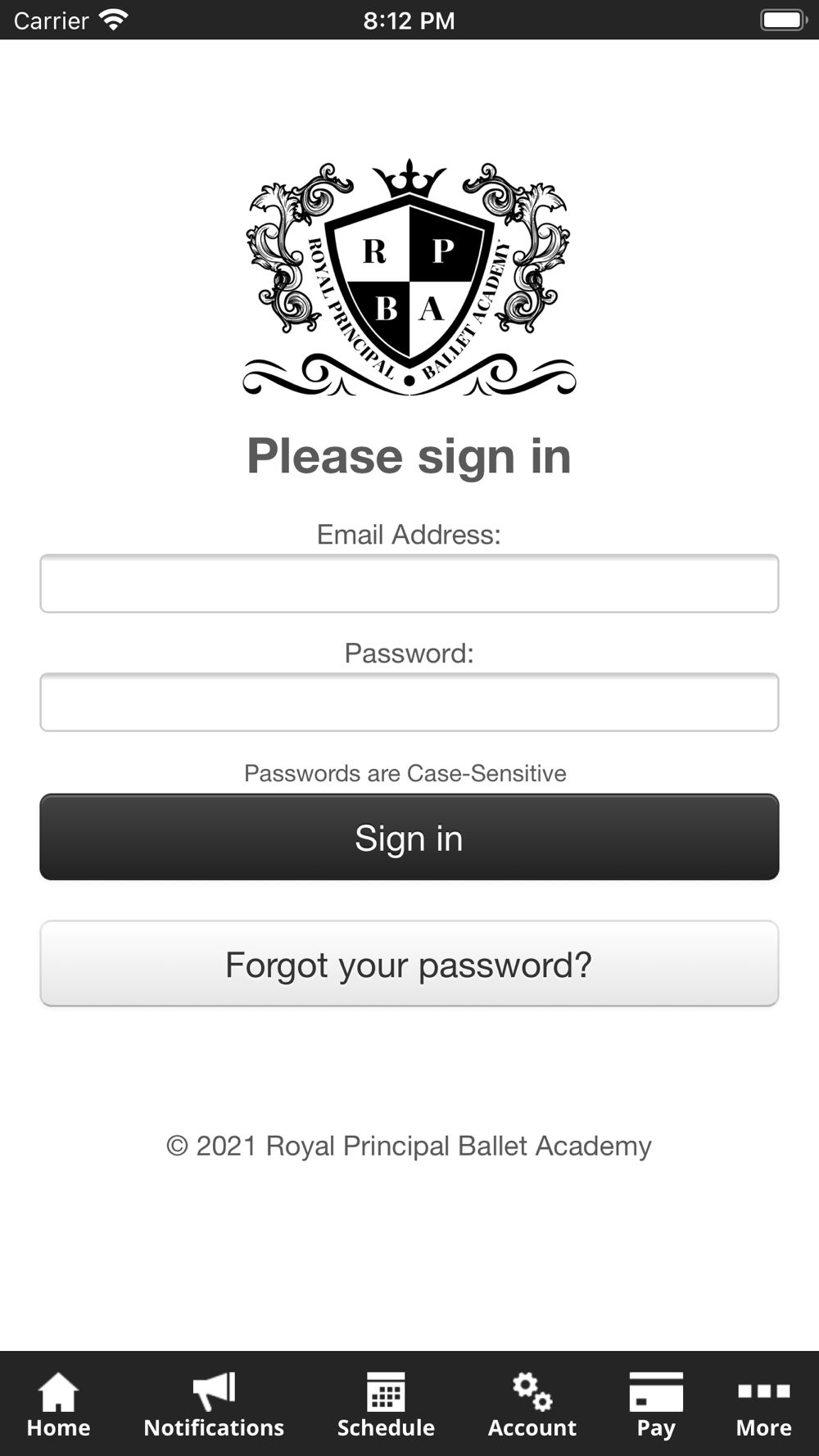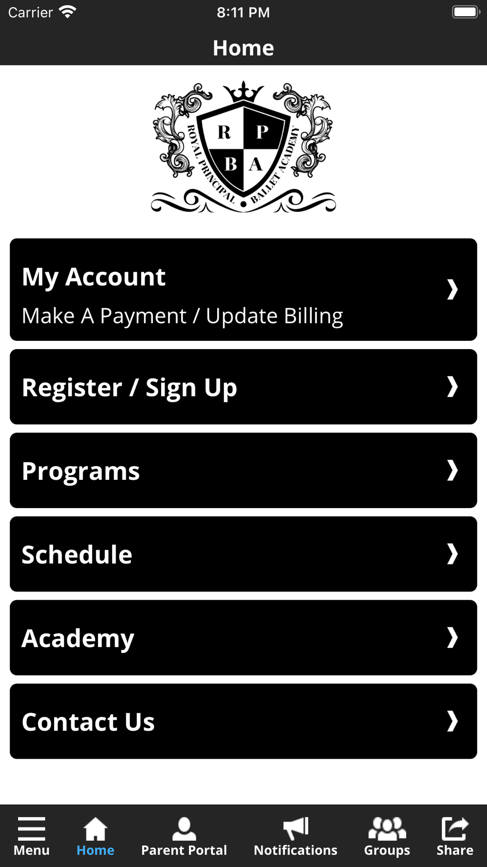 The Royal Principal Ballet Academy app allows you to manage your account with ease, register for classes, parties and special events. You'll also receive important notification about class changes, closings, registration openings, special announcements, and upcoming events.