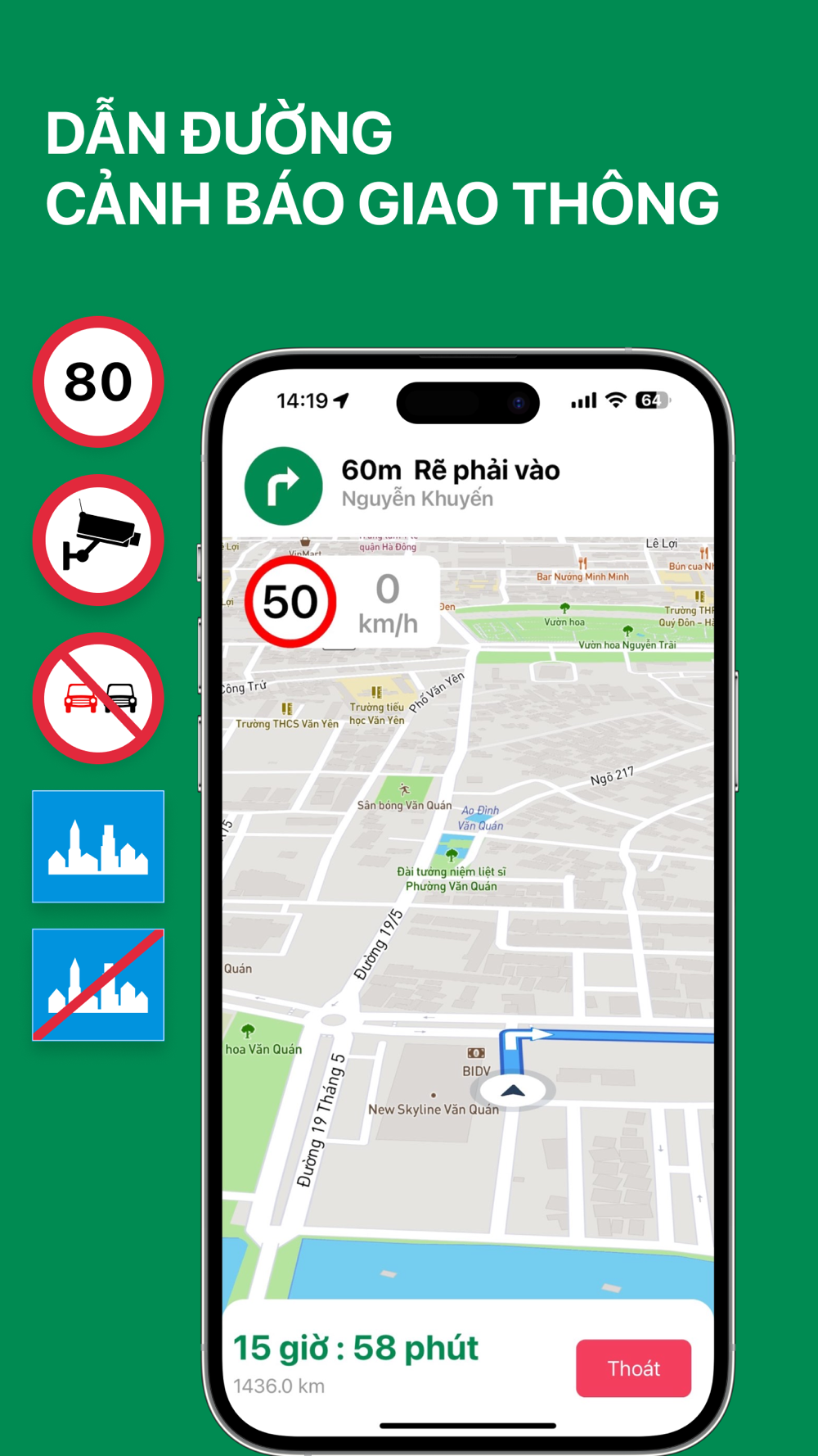 1. Phần mềm dẫn đường kết hợp cảnh thông tin giao thông: Biển báo tốc độ giới hạn, Biển báo vào khu dân cư, Biển báo ra khỏi khu dân cư, Biển báo tới đoạn đường cấm vượt, Camera giao thông, Camera theo dõi tốc độ
