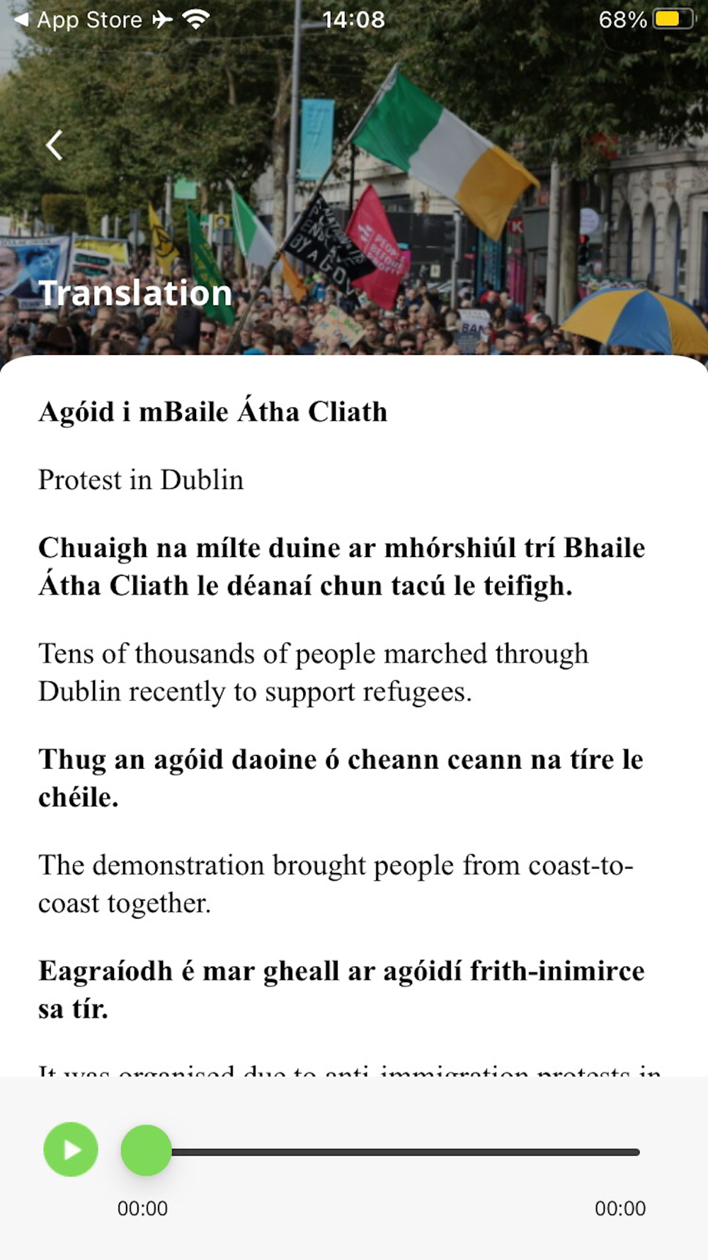 Our app is specifically designed to help you learn and practice Irish language skills through engaging content that features current events. With a combination of Irish text and Irish audio, you'll be able to immerse yourself in the language and improve your fluency in no time.