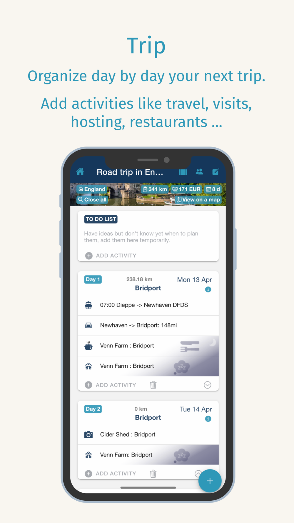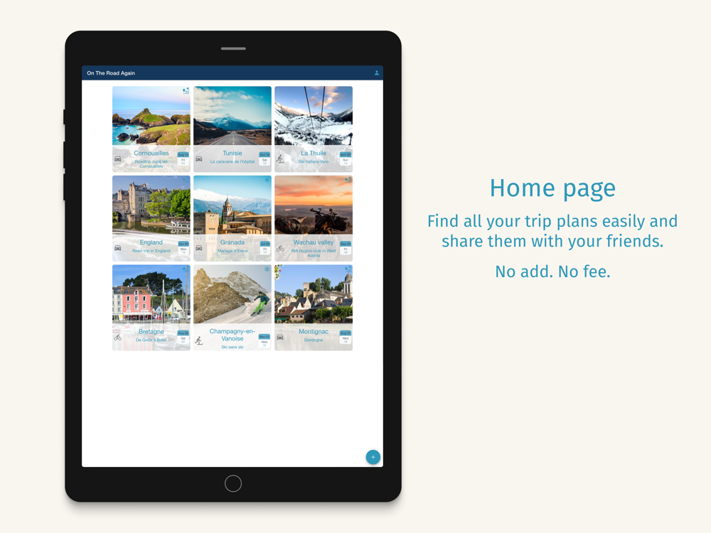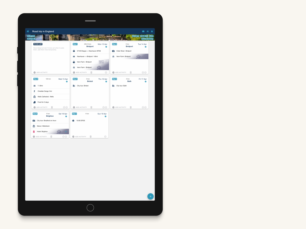 On The Road Again is an easy app to prepare your next trip. Organise easily your activities day by day, visualize your planning, save all your booking references, have a view on your total budget (with multi currency), see it on a map.