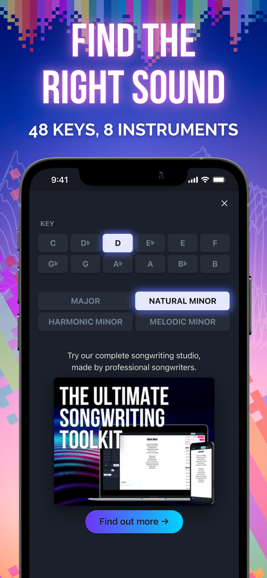 Our simple chord system gives you access to the most popular chords used in modern music, and lets you play them with eight different instruments, all just with a single tap.