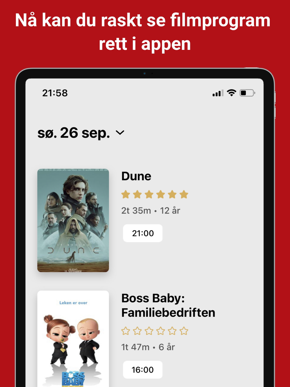 • Rask og god oversikt over kommende filmer, populære filmer og program for de neste dagene.