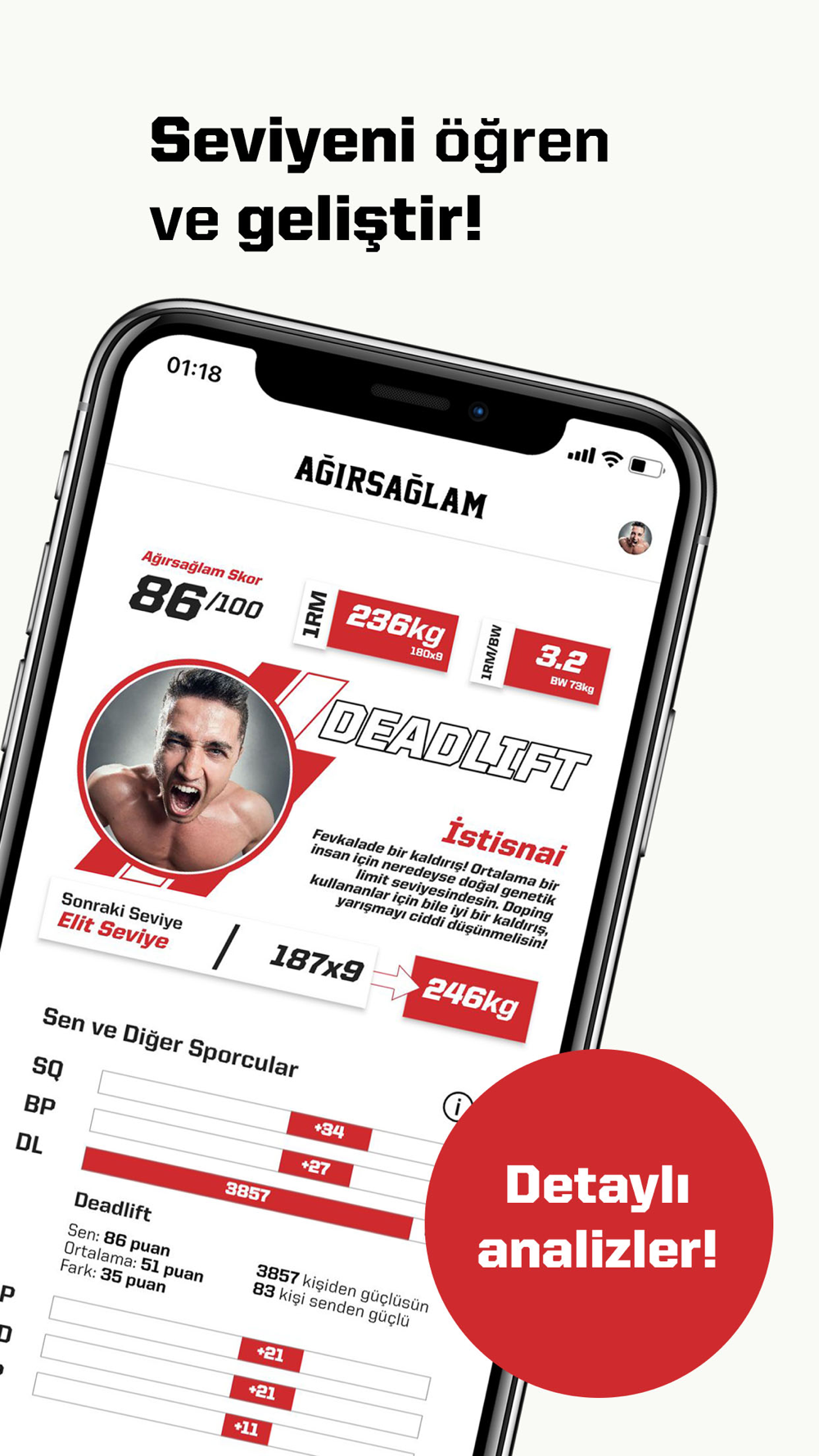 • Ağırsağlam Sıralama Hesaplayıcı: Kaldırışlarını insanlarla karşılaştır ve güç seviyeni öğren.