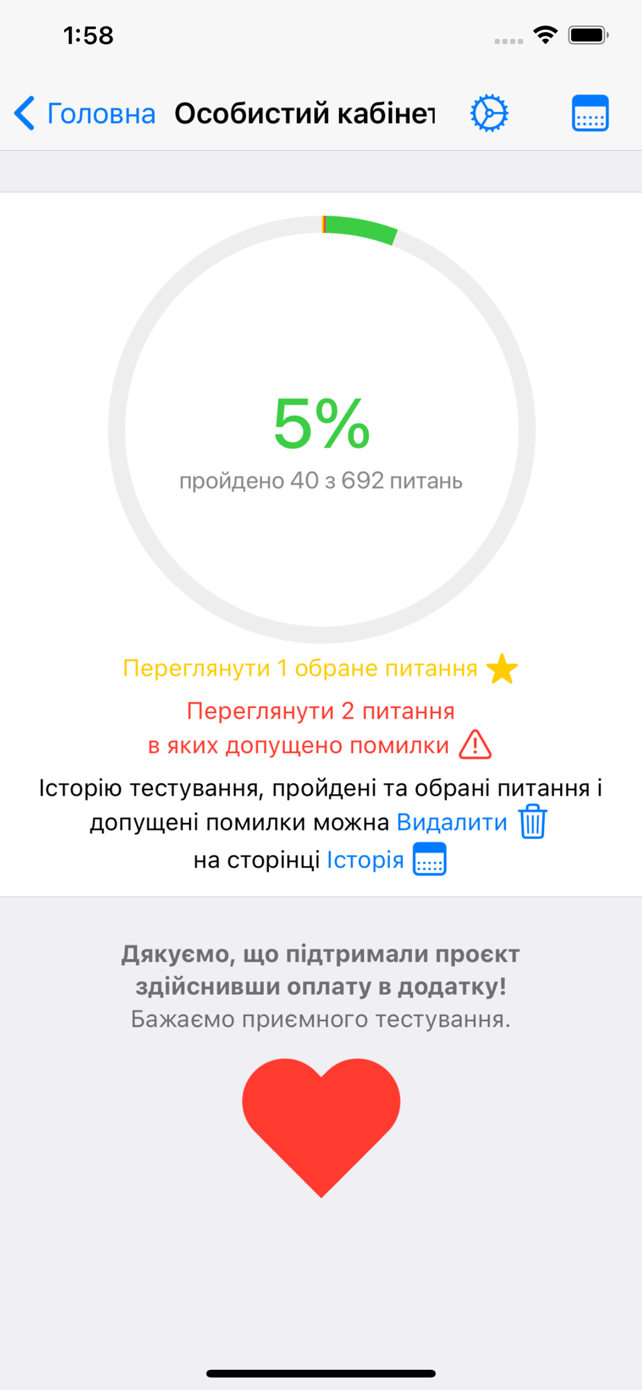 - Тестування по питанняx будь-яких вибраних розділів: підряд, випадково або за важкістю (визначається за статистикою проходження тестів усіма користувачами додатку);