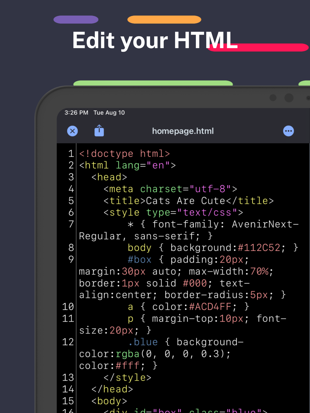With HTML Editor, you can open any existing HTML document on your device or in your iCloud storage. Simply drop your existing HTML document onto our app icon to open that document within HTML Editor.