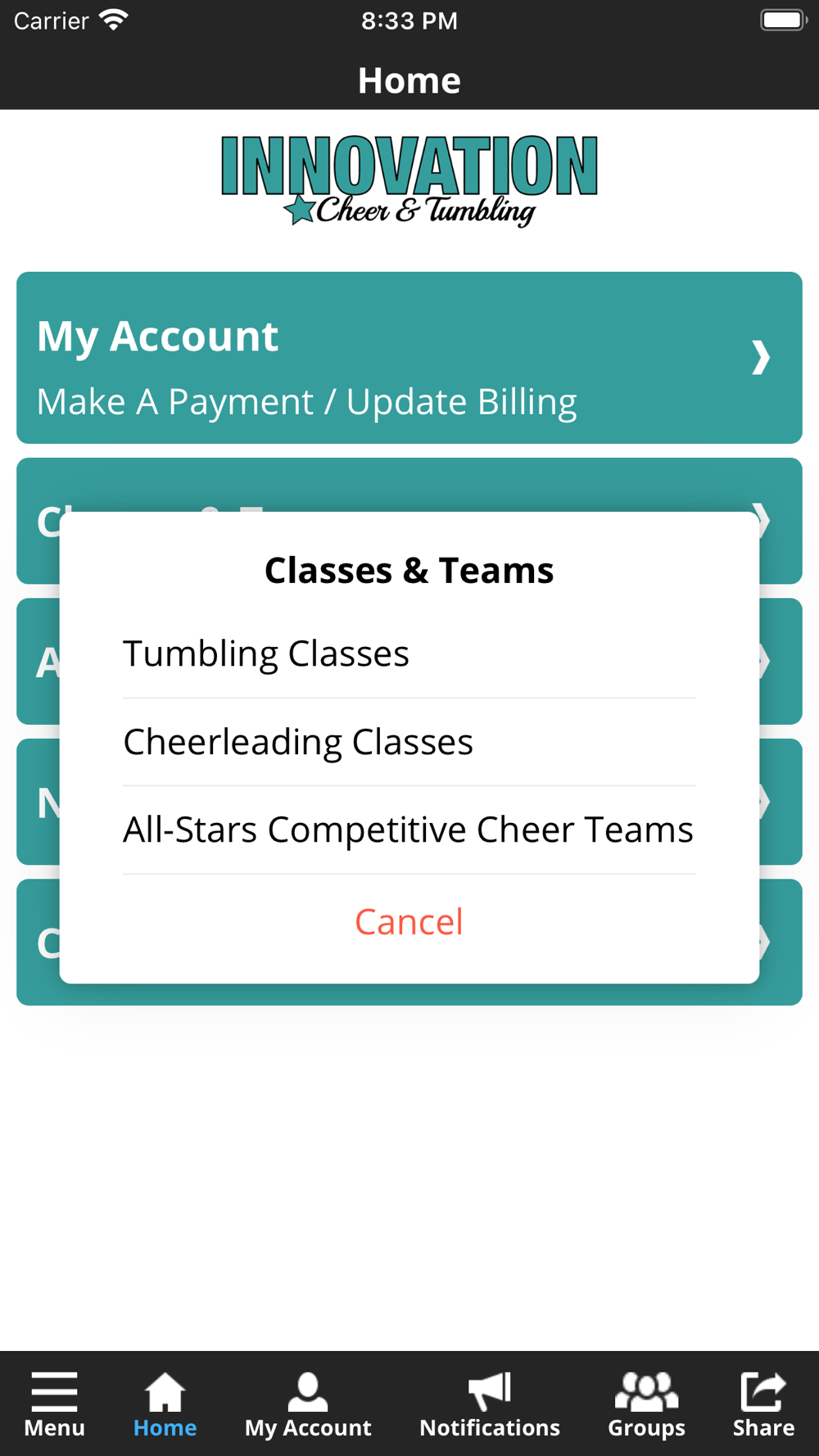 The Innovation Cheer & Tumbling app allows you to manage your account with ease, register for classes and special events. You'll also receive important notification about class changes, closings, registration openings, special announcements, and upcoming events.
