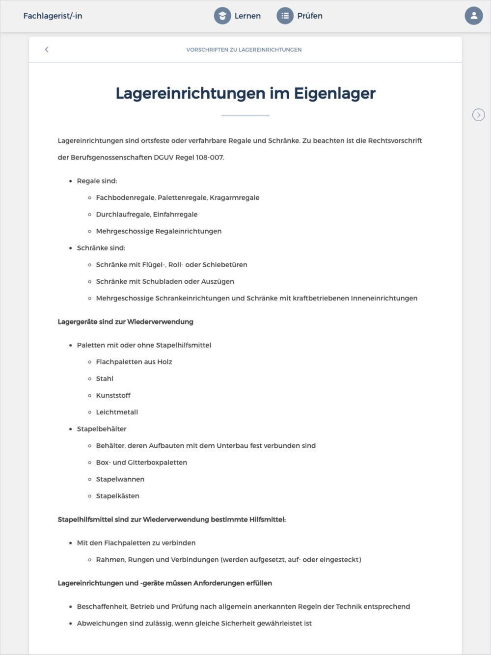Die App „Fachlagerist/-in“ bereitet Sie umfassend auf Ihre bevorstehende theoretische Prüfung zum Fachlagerist/zur Fachlageristin bei der IHK vor. Die Kombination aus einem Lern- sowie einem Prüfbereich dient somit als ideale Lernunterstützung. Außerdem sind Sie jederzeit in der Lage, sich Ihren aktuellen Lernfortschritt darstellen zu lassen, um Rückschlüsse auf eventuelle Wissenslücken führen zu können.