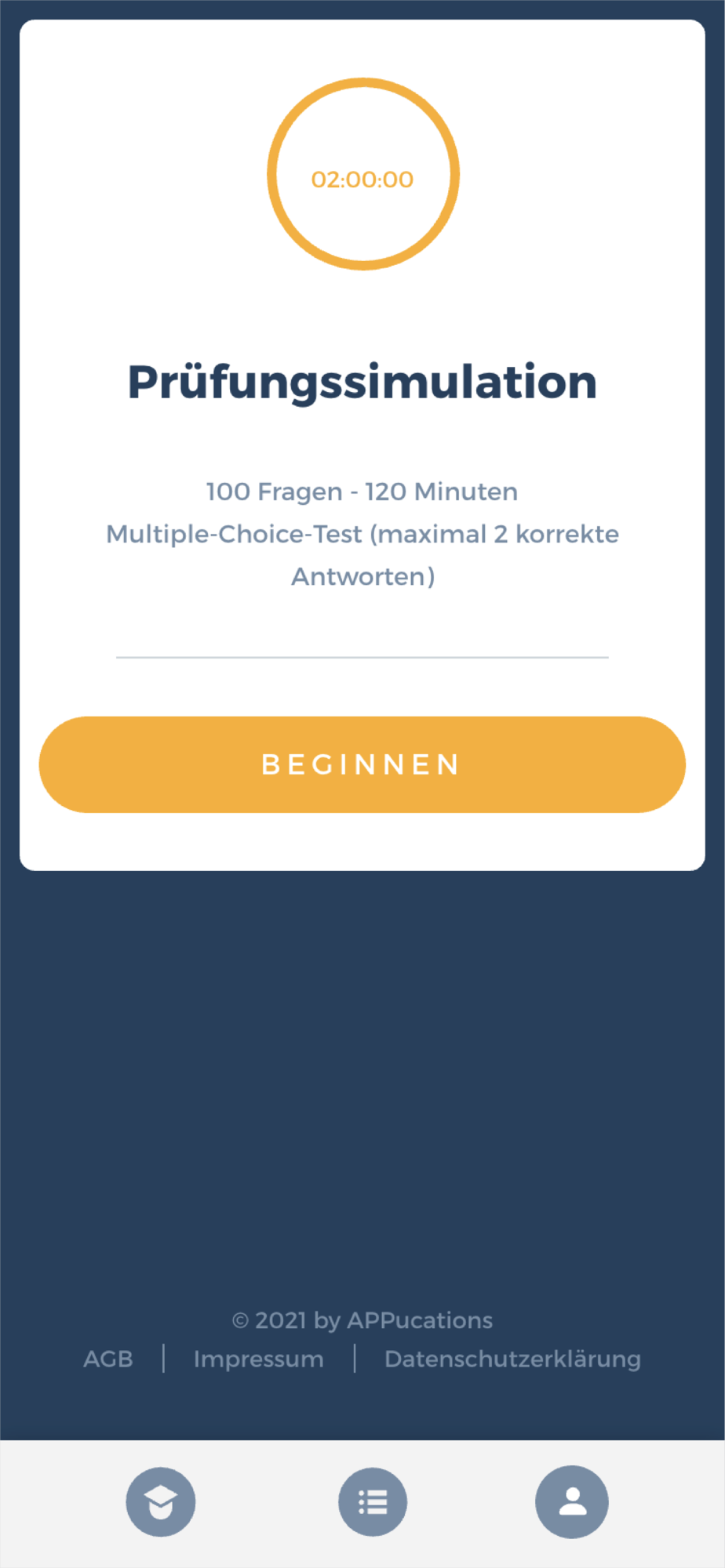 Mit Hilfe der realistischen Prüfungssimulation haben Sie die Möglichkeit, Ihr im Lernbereich zuvor erworbenes Wissen zu testen. Die Rahmenbedingungen entsprechen den allgemeingültigen Vorgaben der IHK in Bezug auf die Zeitvorgaben, Antwortmöglichkeiten, Fragenanzahl usw. Nach einem Testdurchlauf wird in der Statistik ein Bestehen oder Nichtbestehen sofort dargestellt. Zudem kann eine detaillierte Auswertung erfolgen, bei der jede einzelne Frage auf „Richtigkeit“ nachvollzogen werden kann.