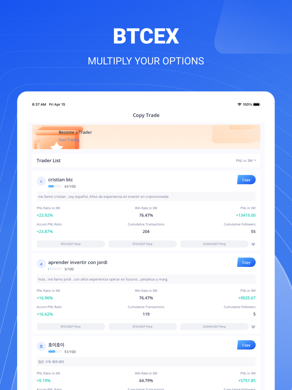 BTCEX cung cấp cho các nhà giao dịch hợp đồng và những người theo dõi trải nghiệm thân thiện, thuận tiện và minh bạch. Chúng tôi cũng đồng bộ hóa danh mục đầu tư tiền điện tử của bạn với các vị thế của nhà giao dịch chuyên nghiệp và cùng nhau chia sẻ lợi nhuận.