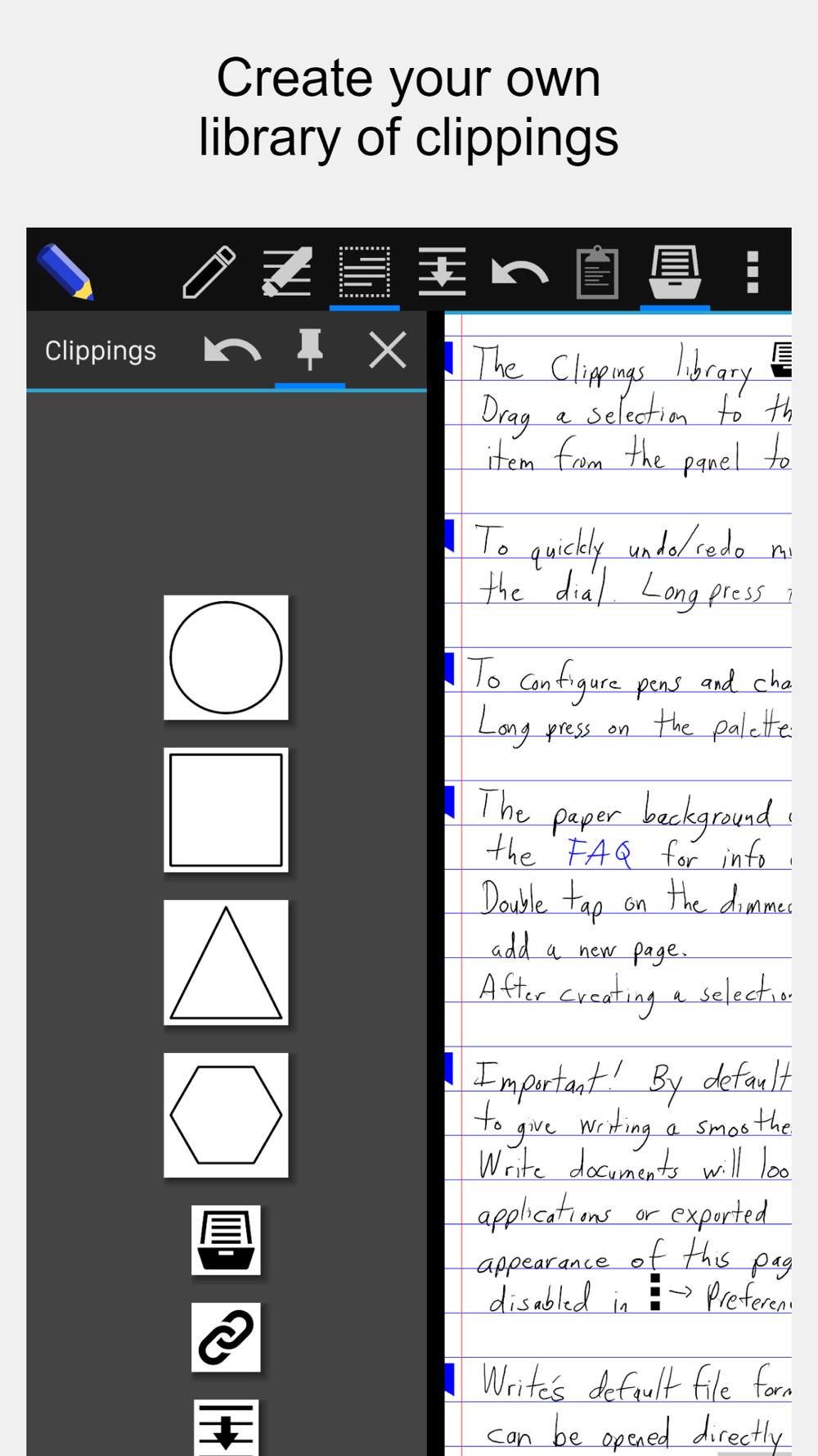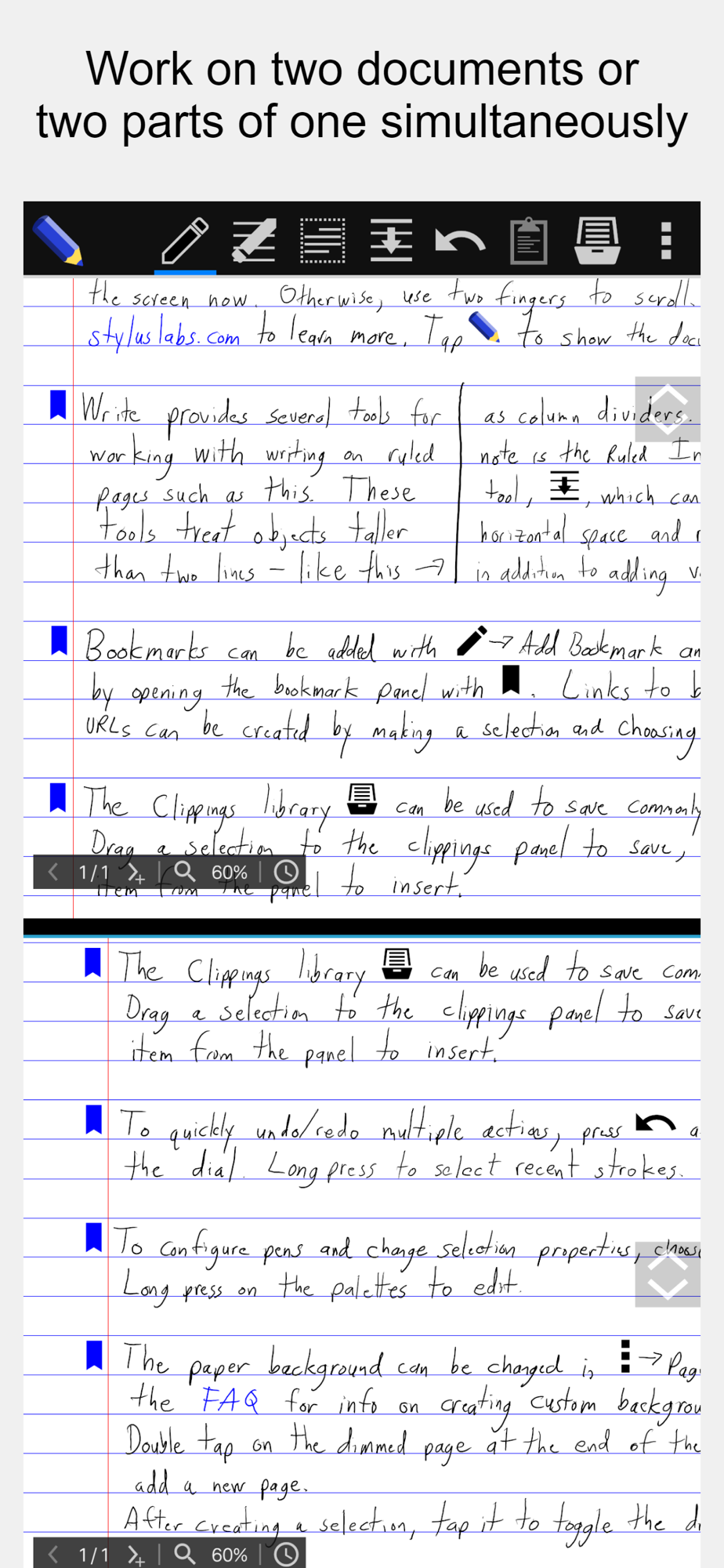 Write provides a unique set of tools for editing and navigating handwritten documents, plus all the usual features of a vector drawing application. Write is perfect for note-taking, brainstorming, and sketching.