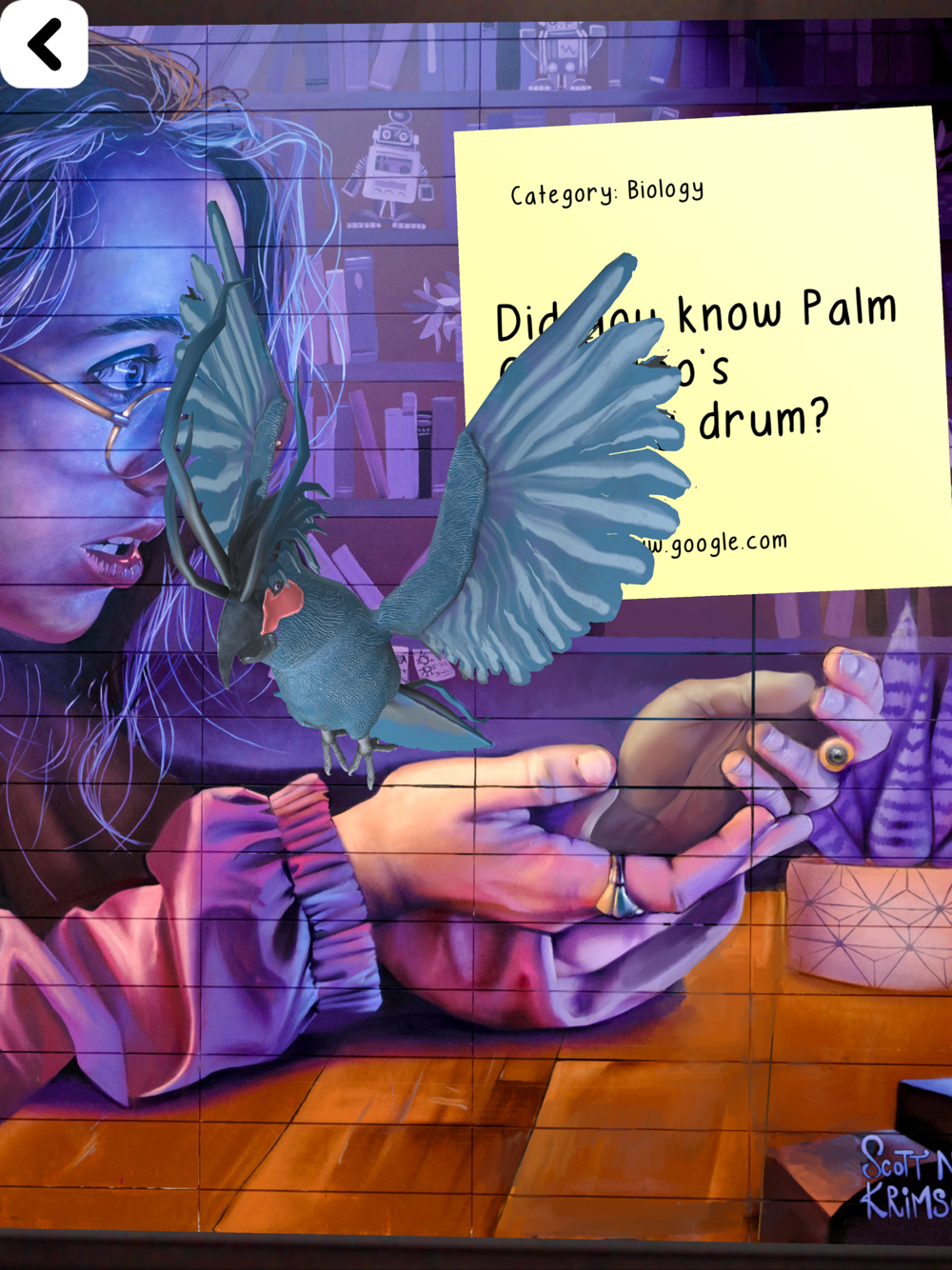 The Rockatoo AR app brings this mural to life with augmented reality, science, and reactions. Learn more about the rare Palm Cockatoo, social robotics, and artificial intelligence. Pose with Rockatoo in the photobooth, and give us your feedback on the future.