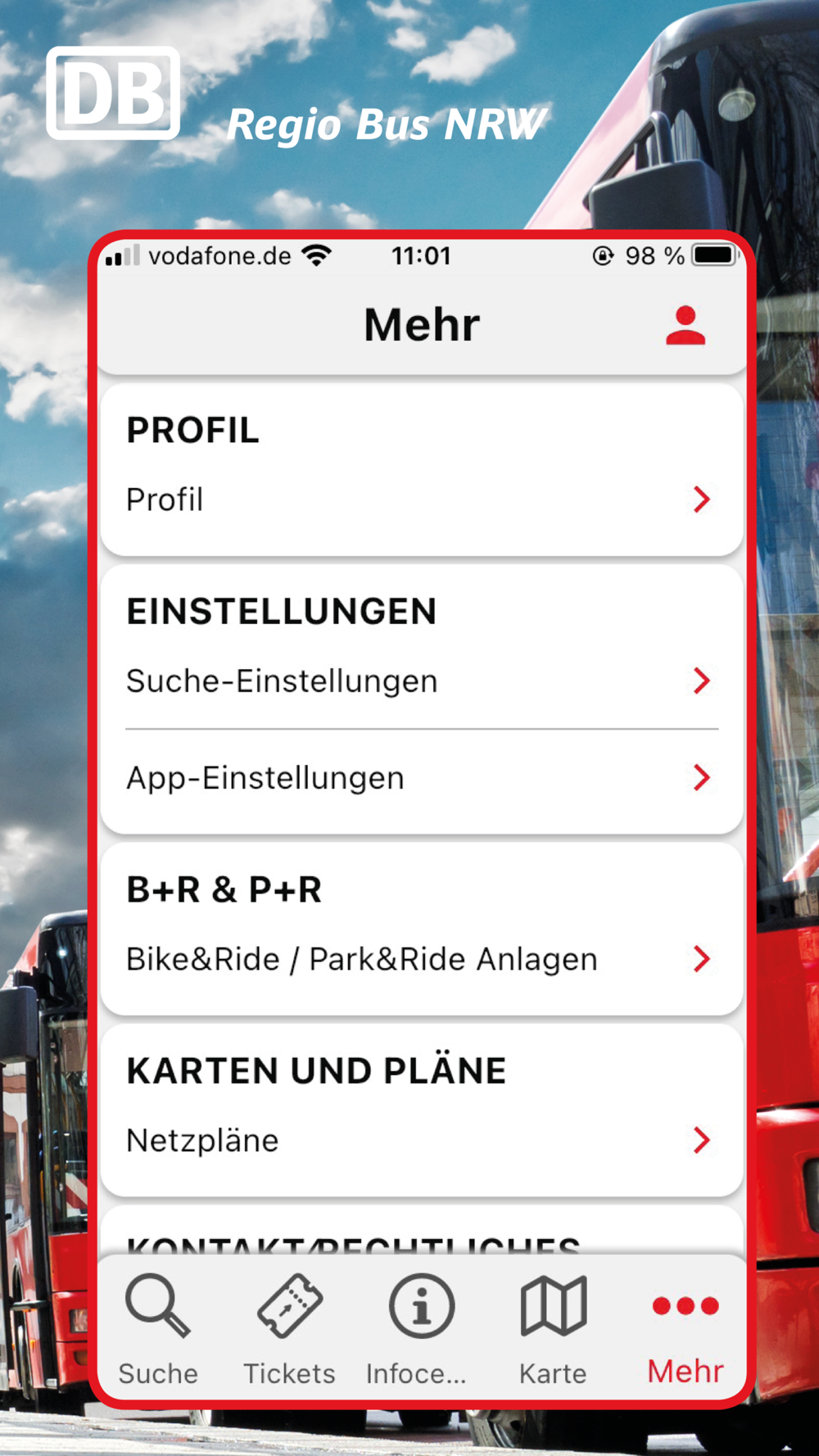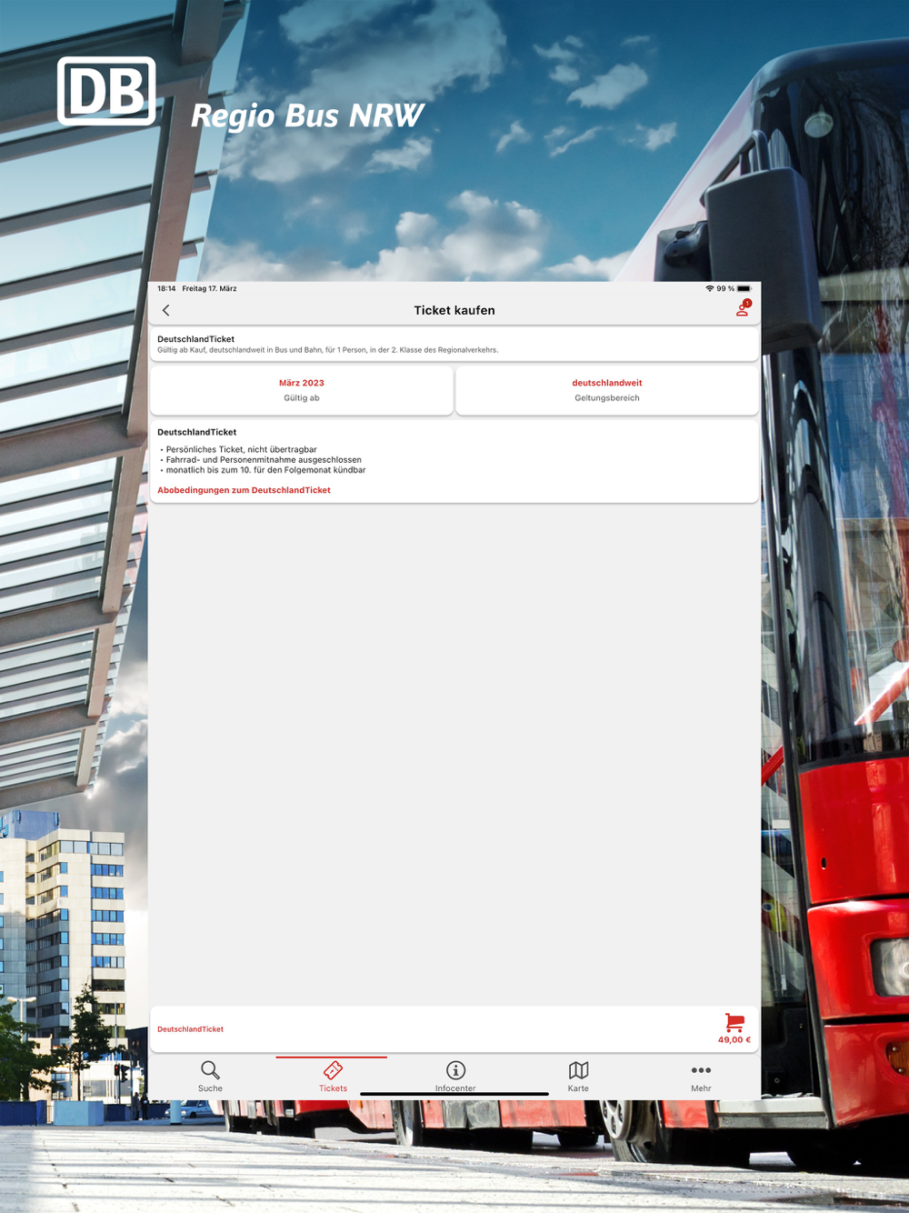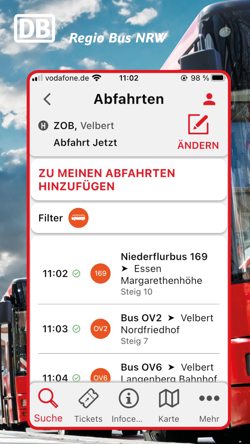 DB NRWay ist der ideale Begleiter für Bus- und Bahnfahrer:innen in NRW. In DB NRWay gibt es nicht nur Tickets für den Verkehrsverbund oder für NRW, sondern mit dem Deutschland-Ticket auch ein bundesweit gültiges Angebot, das wie die anderen Tickets auch, ganz einfach per Klick gekauft werden kann. Die App DB NRWay enthält eine aktuelle Fahrplanauskunft und weitere Informationen über die gewünschten Verbindungen. Damit ist man stets auf dem Laufenden. Das Ticketsortiment erhält Tickets der Verbünde VRR, WestfalenTarif, VRS und den NRW-Tarif. Auch das Deutschland-Ticket sowie die NRW-Upgrades zum Ticket können in DB NRWay von überall und jederzeit gekauft werden. Wer es einfach und bequem haben möchte, nutzt den Luftlinientarif eezy.nrw für Bus und Bahn. Das geht mit der App kinderleicht: Mit einem Klick Einchecken und nach der Fahrt per Klick wieder Auschecken.