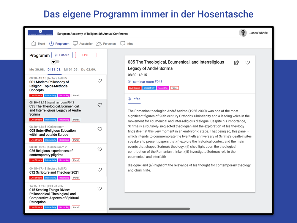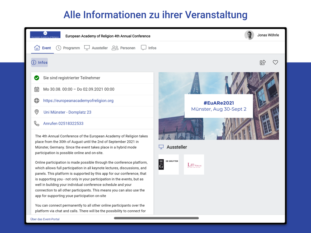 The European Academy of Religion is holding its 4th Annual Conference in Münster (Germany) from August 30th until September 2nd this year. The conference will take place as a hybrid event and offer the possibility for participation online and on-site. This App will help you accessing the panels, keynote lectures and discussions in an easy way and support you in creating your individual conference schedule as well as giving you the opportunity to get in contact with other participants.