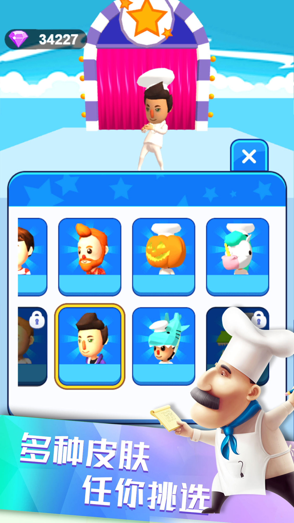 这是一款休闲小游戏,在游戏中你作为厨师,为等在终点的客人提供面条,你跨越重重阻碍,收集面条,尽可能多的为客户提供面条。