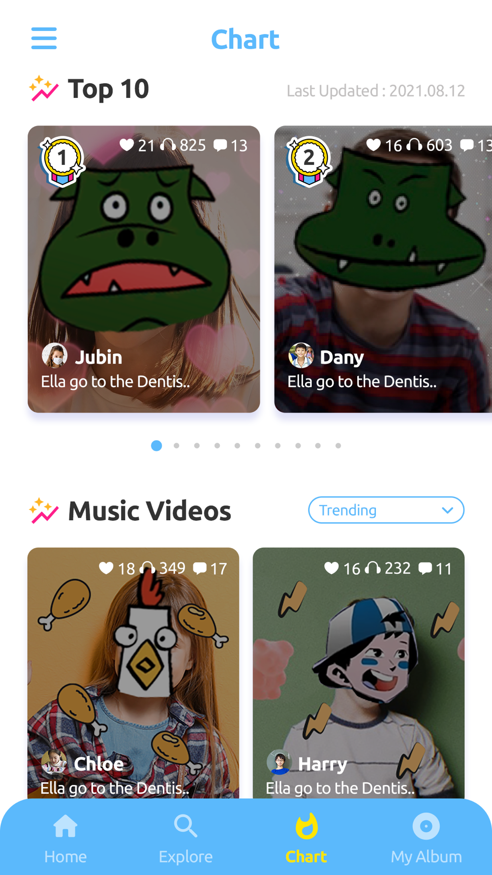 엘라게이터만의 귀여운 AR 스티커를 사용하여 뮤직비디오를 만들어보세요.